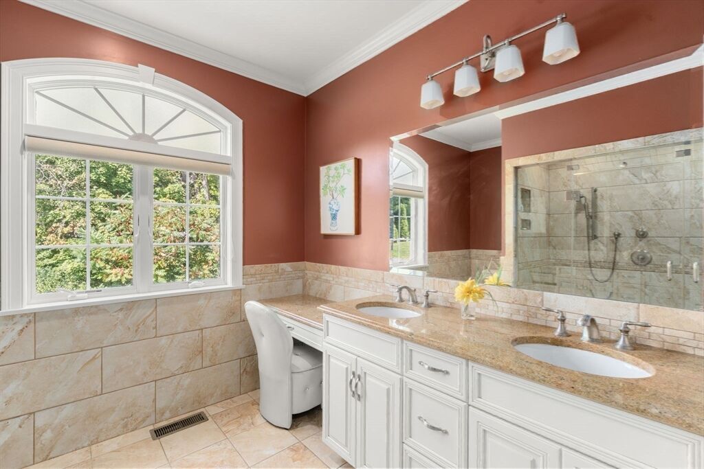 Elegant End Unit in Village Estates awaits you. This beautifully designed end unit is perfect for entertaining, featuring an open-concept first floor with hardwood floors throughout. The kitchen boasts custom cabinets, granite countertops, stainless steel appliances, and an oversized island. The living room offers soaring ceilings, built-ins, and a fireplace, with French doors leading to a sunroom with a gas stove and scenic views. The first-floor primary suite includes a spacious walk-in closet and en-suite bath. Upstairs, you'll find two large bedrooms, a full bath, and a versatile catwalk ideal for an office or reading nook. The expansive walkout basement adds even more living space with an office, gym, full bath, cedar closet, and a 29x22 entertainment area.