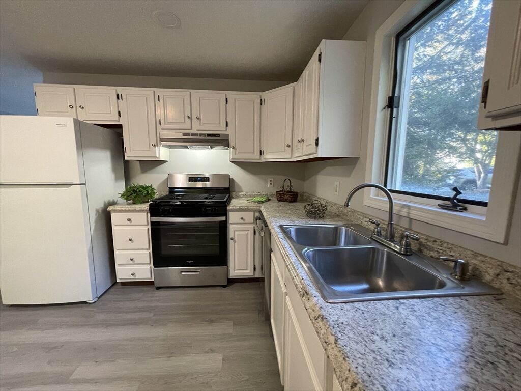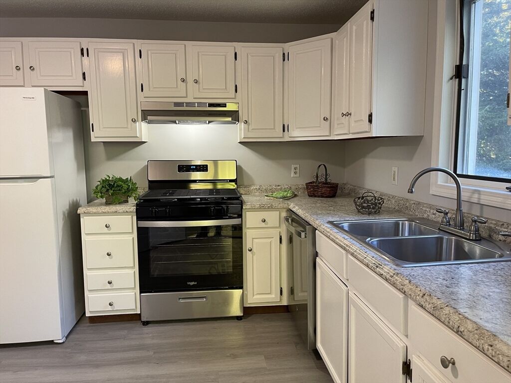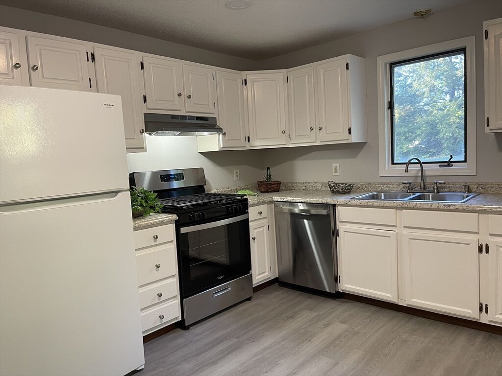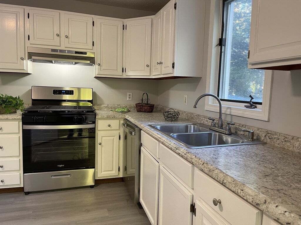 Bright, Sunny & Convenient – Adorable 2-Bedroom Ranch-Style End Unit: Enjoy the ease of one-level living in this charming, sun-filled 2-bedroom end unit. The spacious layout features a welcoming living room, an eat-in kitchen with direct access to a private covered patio, and a generous primary bedroom with its own private bath. A second full-size bathroom boasts a sleek Corian countertop, and the in-unit laundry includes a newer stackable washer and dryer for added convenience. Brand-new luxury laminate flooring flows throughout the home, paired with a brand-new stainless-steel dishwasher and stove in the kitchen for modern comfort. Located just minutes from downtown restaurants, shops, highways, schools, parks, and trails—this home offers the perfect blend of accessibility and tranquility. With a low HOA fee, it’s ideal for first-time buyers or those looking to downsize and relax. Don’t miss this delightful opportunity—schedule your visit today!