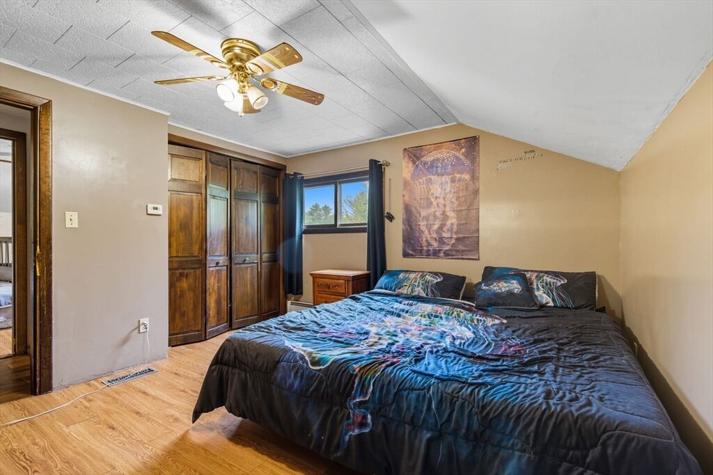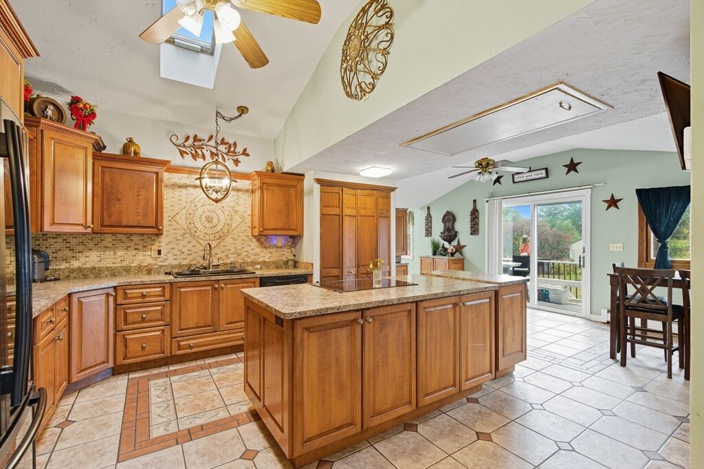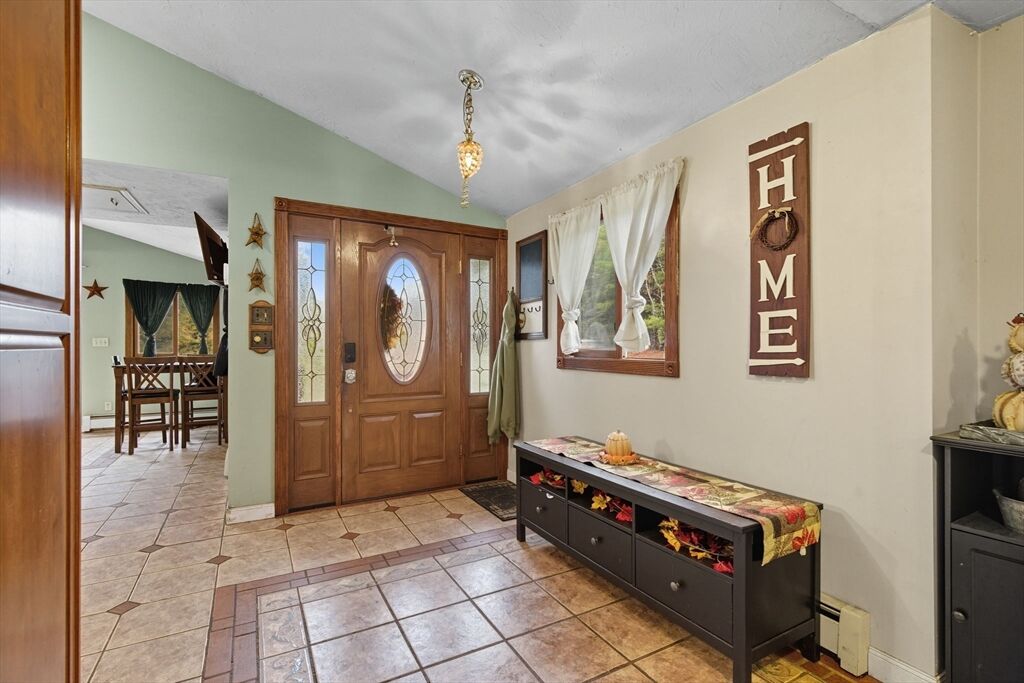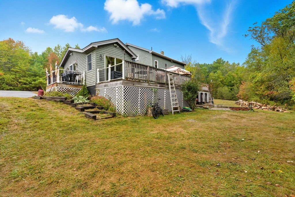 Welcome to 106 Gardner Rd in Hubbardston. This 3-bedroom, 1.5-bath Colonial offers over 1,700 sq. ft. of living space on nearly 2 acres of land. The main level features an open kitchen with cathedral ceiling, skylights, island, and pantry, flowing into a dining room with bay window and stone tile flooring. A spacious living room with pellet stove and slider opens to the deck and backyard. Upstairs, the primary bedroom includes a walk-in closet and ceiling fan, along with two additional bedrooms and a full bath with solid-surface vanity. Exterior highlights include a front porch, wood deck, storage shed, and garden area.