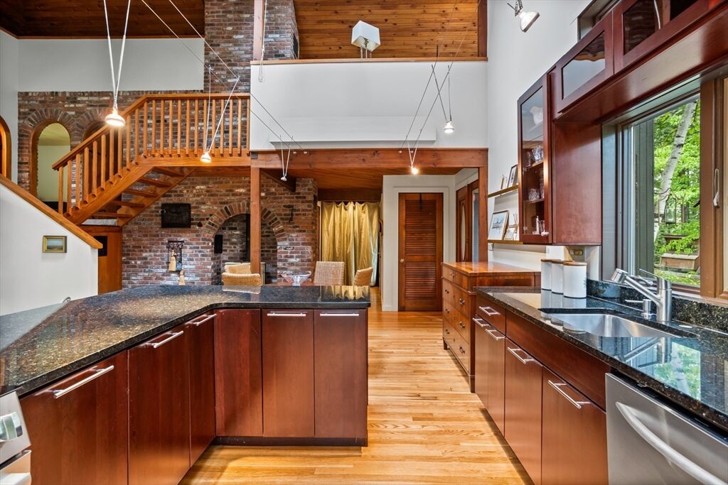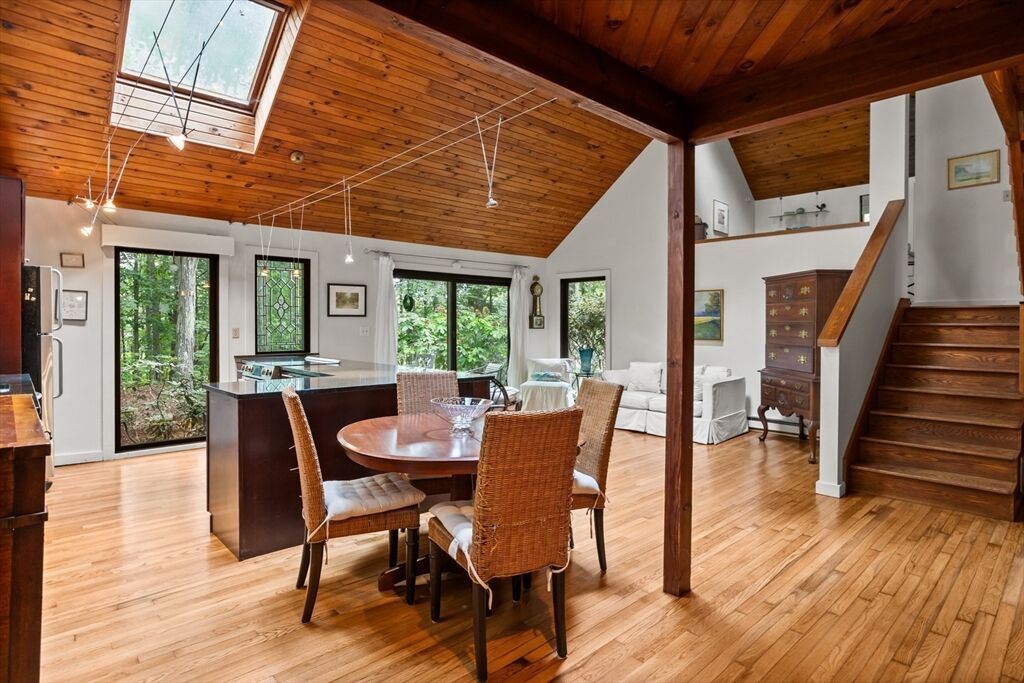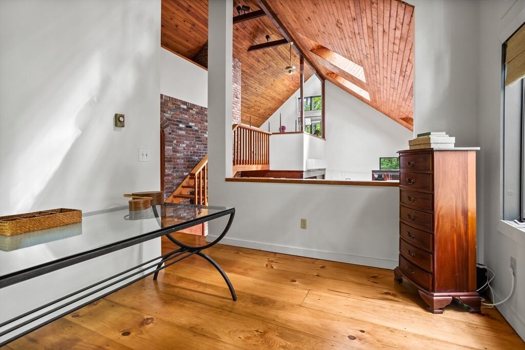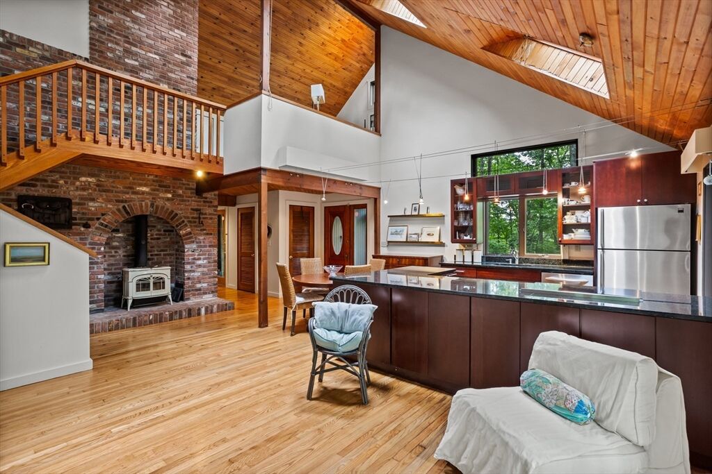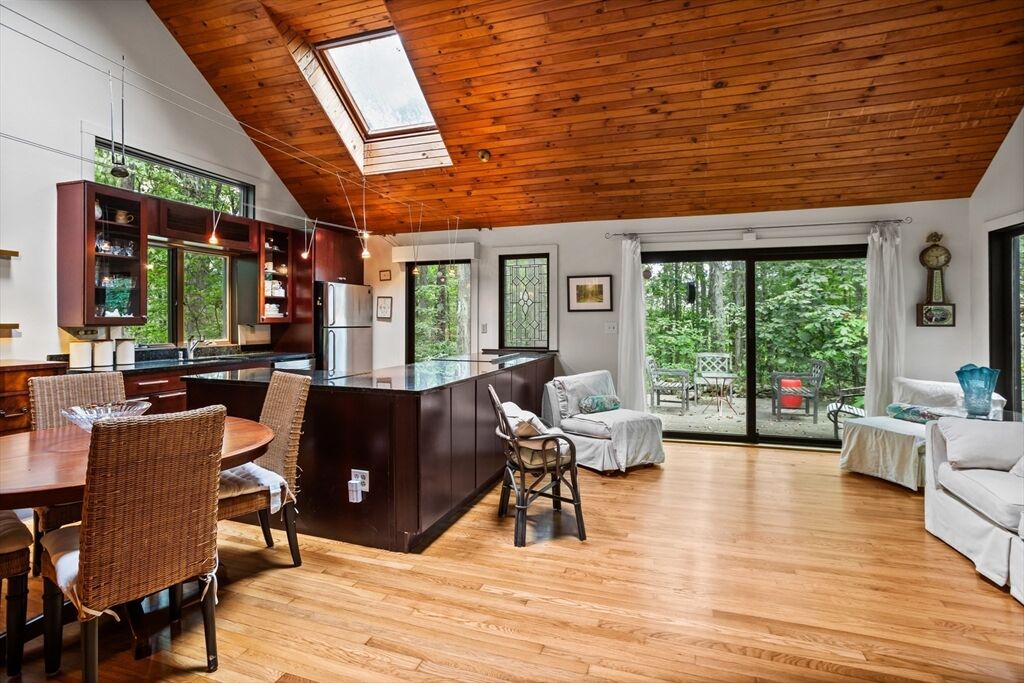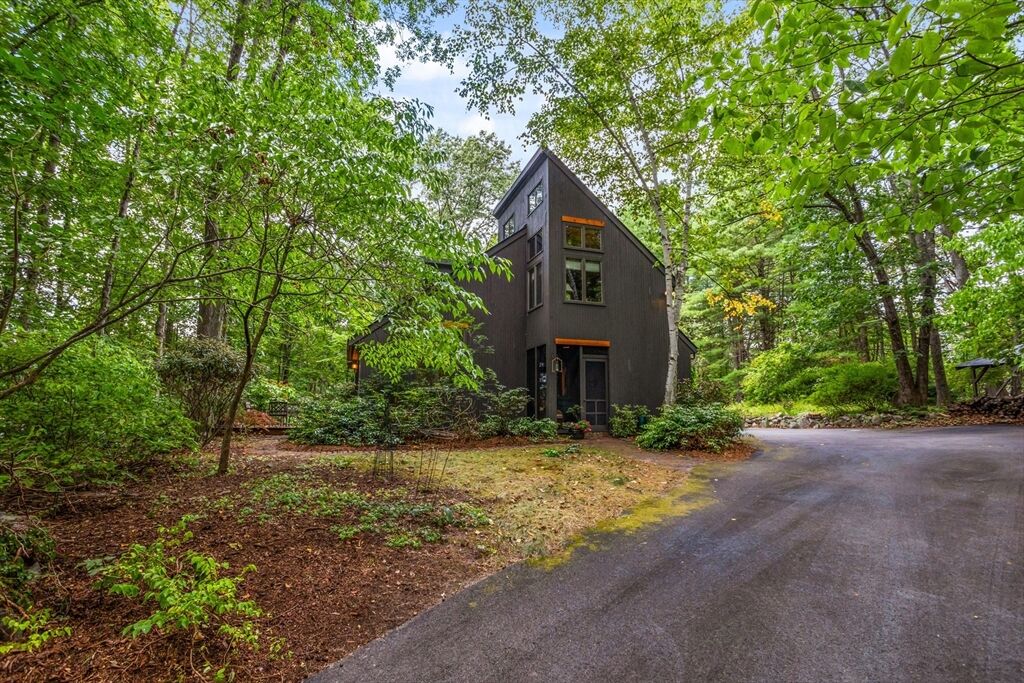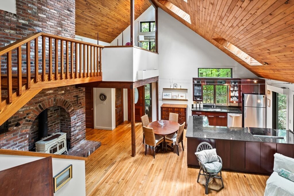 Presenting 109 Pond St! Quality craftsmanship & character abound in this standout Dunstable gem! Set back from the road, the home offers a tranquil escape yet is close to downtown Dunstable and minutes from Route 3. Refinished hardwood floors, engraved wood trim, arched doors, unique architectural details at every turn! First floor includes laundry and pantry. An open floor plan with soaring ceiling & 3 skylights is perfect for entertaining. The kitchen boasts granite countertops, new stove & hardwood floors. A fireplace & wood burning stove complete the area. Sliding glass doors seamlessly connect to the outdoor deck, perfect for morning coffee. Upstairs has 3 bedrooms, full bath with a cathedral ceiling, skylight & separate sauna room! The primary bedroom has a large closet and extra area suitable for a desk or reading nook. Added bonuses include an 8-year young metal roof, exterior painting in 2024 and low maintenance yard. Don't miss the chance to see this stunning property!