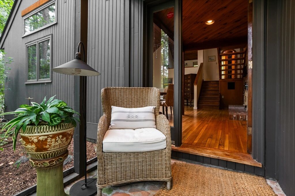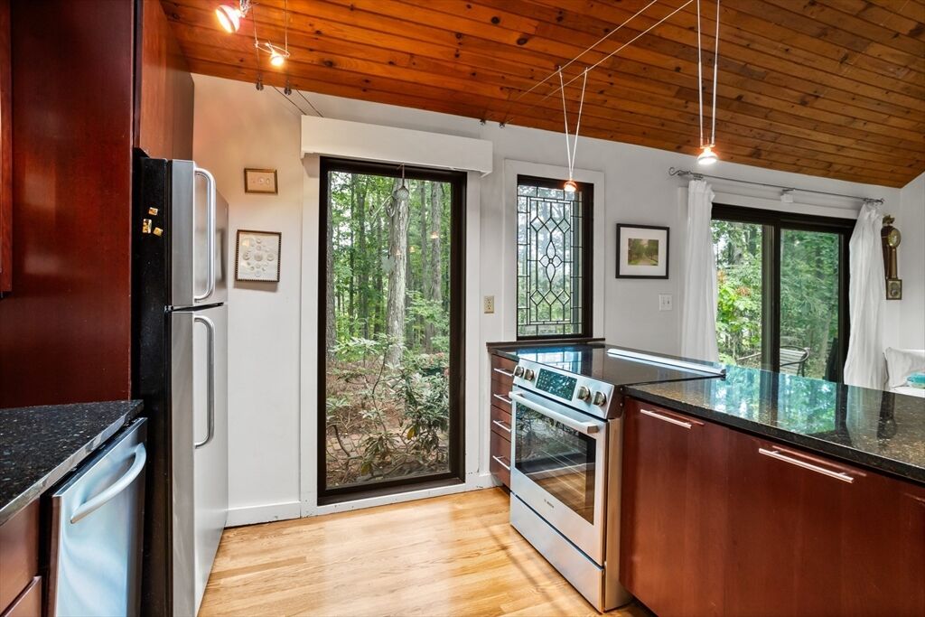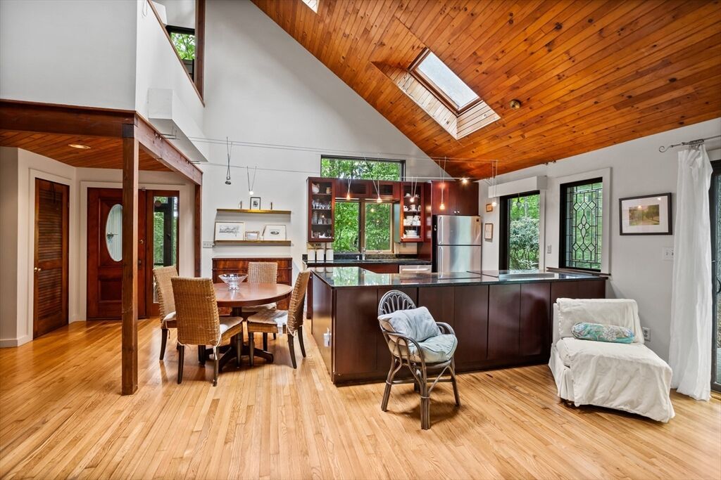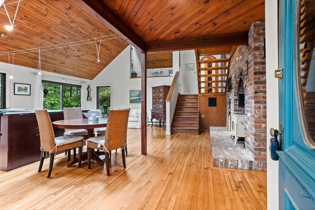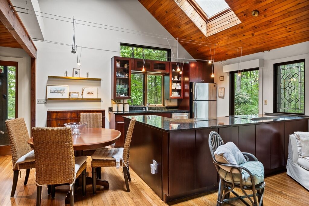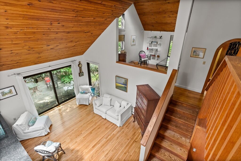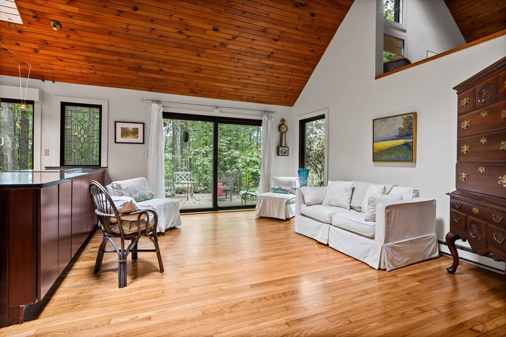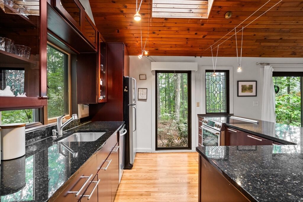 Presenting 109 Pond St! Quality craftsmanship & character abound in this standout Dunstable gem! Set back from the road, the home offers a tranquil escape yet is close to downtown Dunstable and minutes from Route 3. Refinished hardwood floors, engraved wood trim, arched doors, unique architectural details at every turn! First floor includes laundry and pantry. An open floor plan with soaring ceiling & 3 skylights is perfect for entertaining. The kitchen boasts granite countertops, new stove & hardwood floors. A fireplace & wood burning stove complete the area. Sliding glass doors seamlessly connect to the outdoor deck, perfect for morning coffee. Upstairs has 3 bedrooms, full bath with a cathedral ceiling, skylight & separate sauna room! The primary bedroom has a large closet and extra area suitable for a desk or reading nook. Added bonuses include an 8-year young metal roof, exterior painting in 2024 and low maintenance yard. Don't miss the chance to see this stunning property!