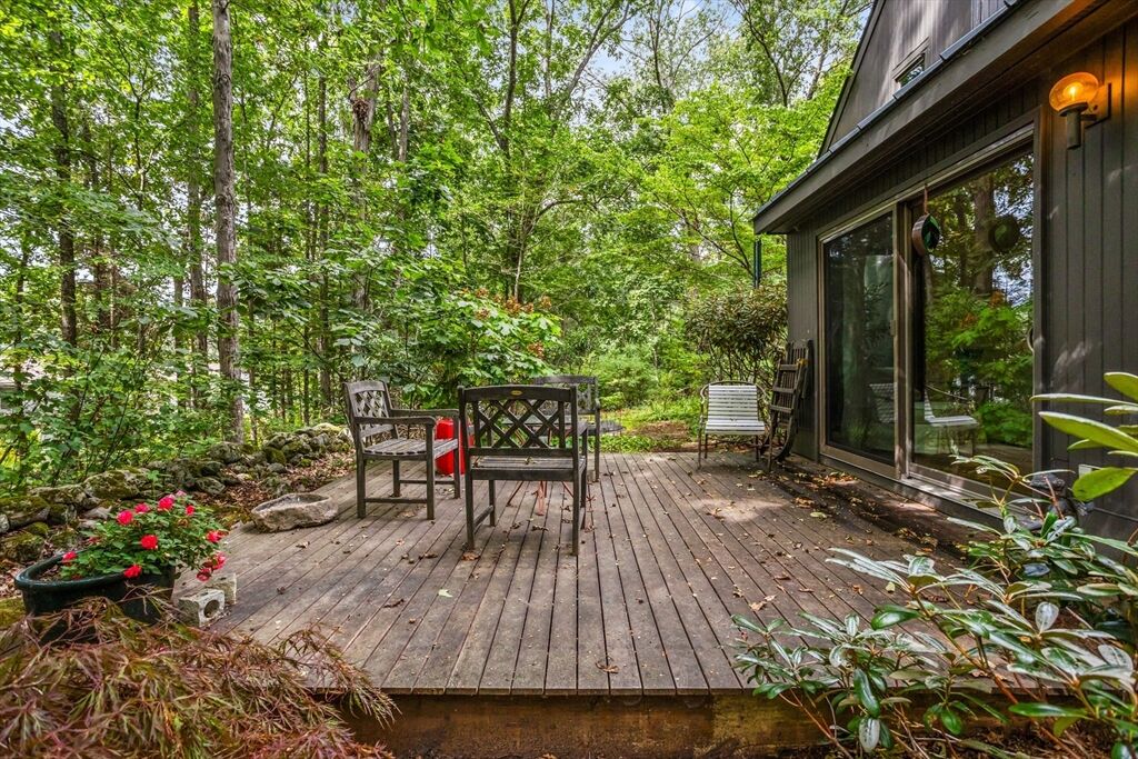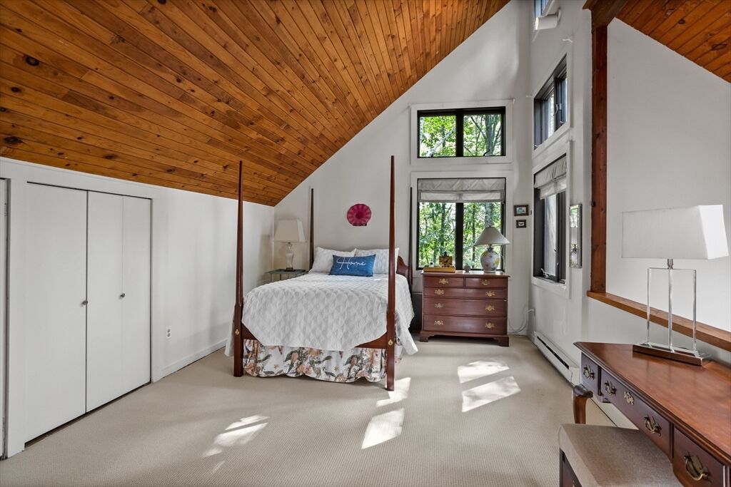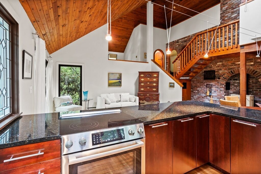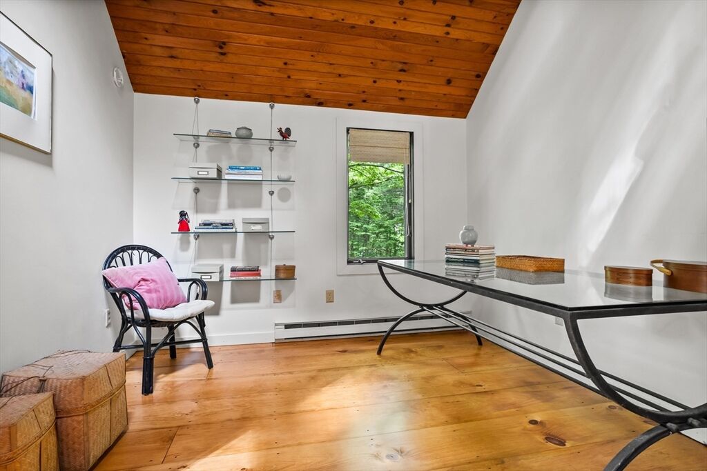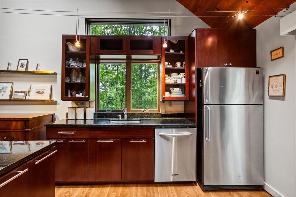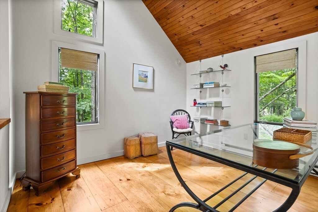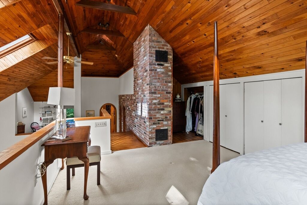 Presenting 109 Pond St! Quality craftsmanship & character abound in this standout Dunstable gem! Set back from the road, the home offers a tranquil escape yet is close to downtown Dunstable and minutes from Route 3. Refinished hardwood floors, engraved wood trim, arched doors, unique architectural details at every turn! First floor includes laundry and pantry. An open floor plan with soaring ceiling & 3 skylights is perfect for entertaining. The kitchen boasts granite countertops, new stove & hardwood floors. A fireplace & wood burning stove complete the area. Sliding glass doors seamlessly connect to the outdoor deck, perfect for morning coffee. Upstairs has 3 bedrooms, full bath with a cathedral ceiling, skylight & separate sauna room! The primary bedroom has a large closet and extra area suitable for a desk or reading nook. Added bonuses include an 8-year young metal roof, exterior painting in 2024 and low maintenance yard. Don't miss the chance to see this stunning property!
