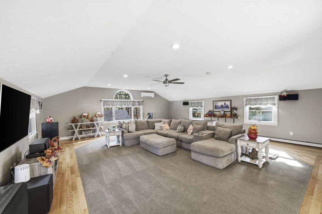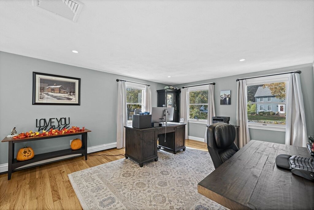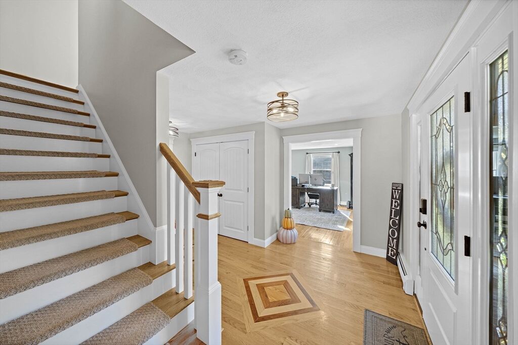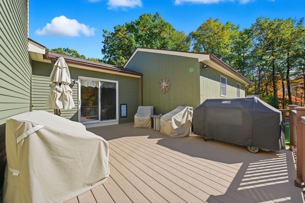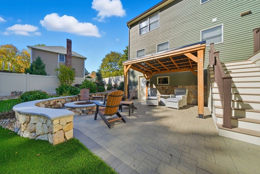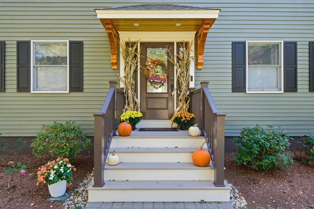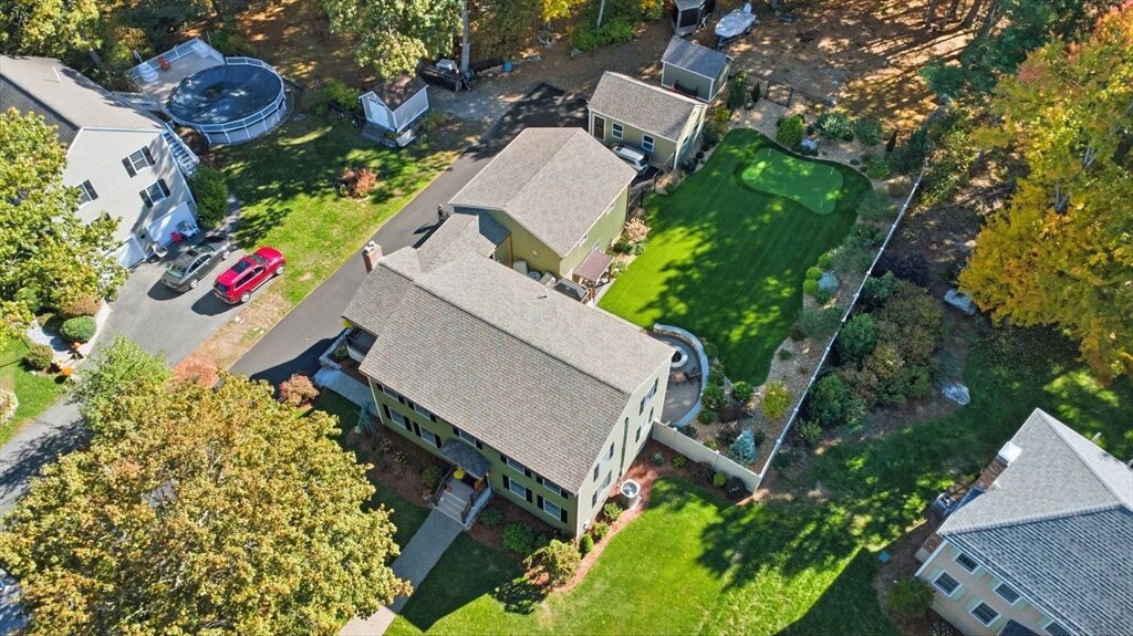 Welcome home to this charming colonial situated on a peaceful cul-de-sac with town sewer! Step inside from the inviting porch into an open-concept kitchen featuring a stunning tile backsplash, quartz countertops, and a spacious island that seamlessly connects to the dining room and a cozy den with a pellet stove. French doors open to a welcoming great room, ideal for family gatherings. Front to back primary suite with walk in closet, and master bath with his and her sinks. The backyard is a private oasis with a deck, patio with a firepit, and a putting green—perfect for entertaining. The heated garage is ideal for a workshop or car enthusiast. Two sheds make the perfect space for an additional car, or extra storage. Enjoy outdoor activities near Patch’s Pond, great for long walks, fishing and skating. Full basement is just waiting to be finished for more living space. Convenient acccess to commuter rail, shopping, and major routes. Open House Sat 11/1 and Sun 11/2 from 11 to 12:30.