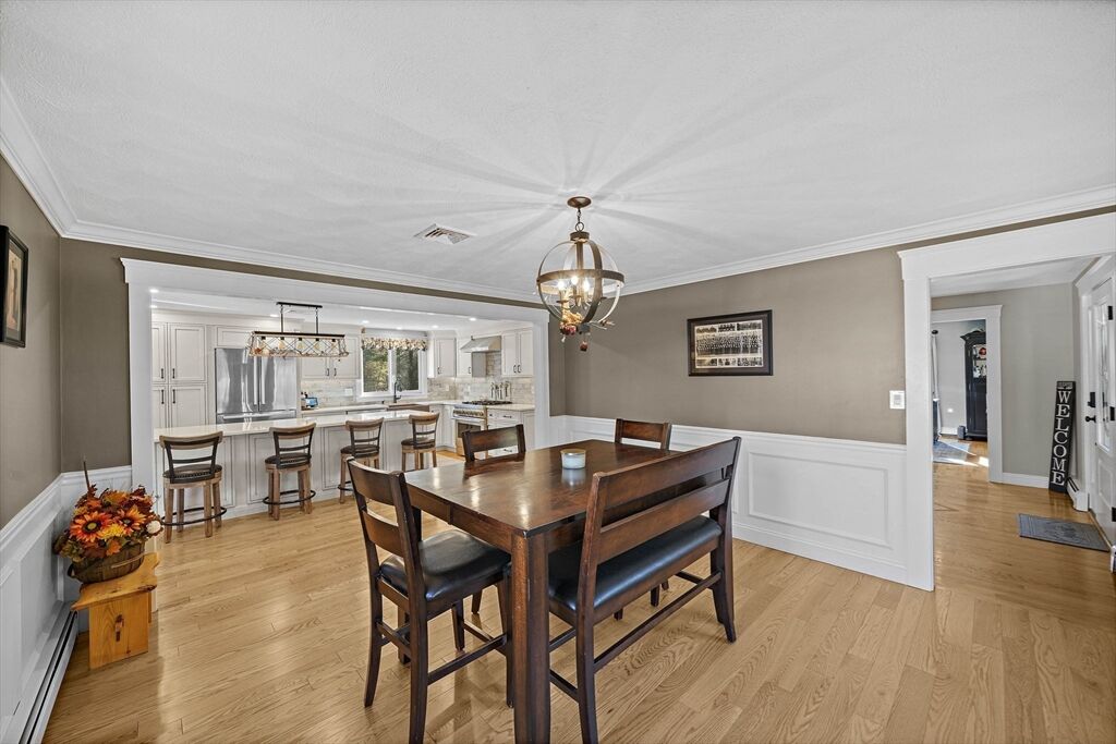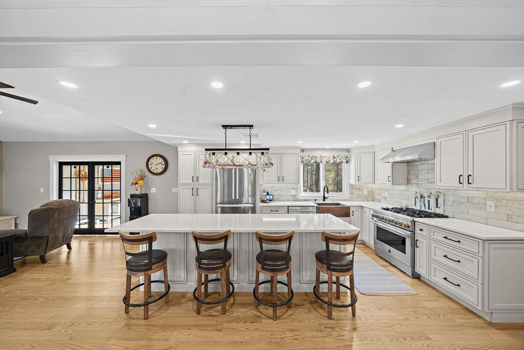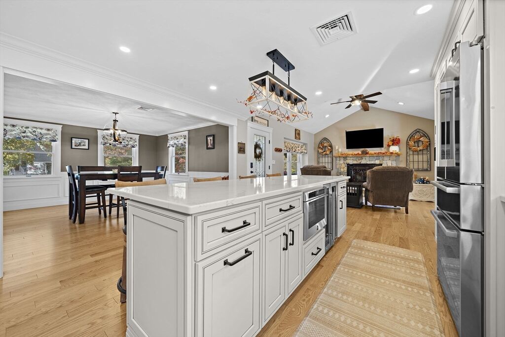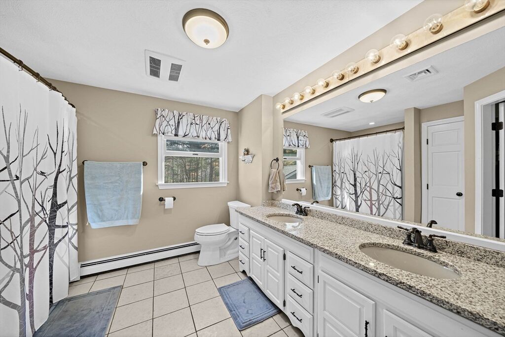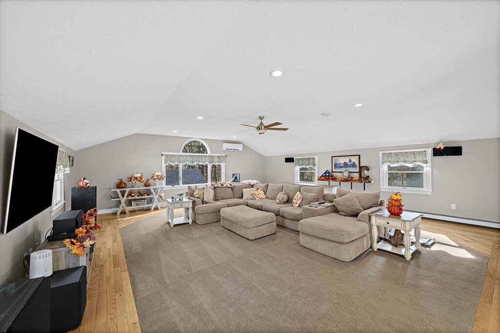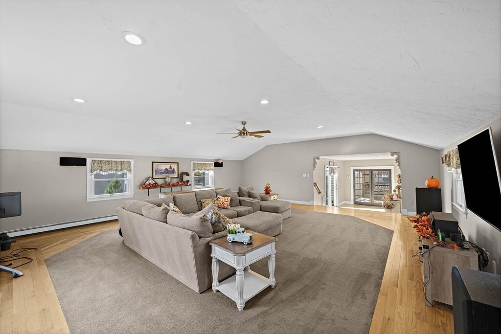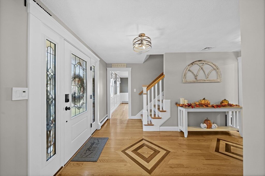 Welcome home to this charming colonial situated on a peaceful cul-de-sac with town sewer! Step inside from the inviting porch into an open-concept kitchen featuring a stunning tile backsplash, quartz countertops, and a spacious island that seamlessly connects to the dining room and a cozy den with a pellet stove. French doors open to a welcoming great room, ideal for family gatherings. Front to back primary suite with walk in closet, and master bath with his and her sinks. The backyard is a private oasis with a deck, patio with a firepit, and a putting green—perfect for entertaining. The heated garage is ideal for a workshop or car enthusiast. Two sheds make the perfect space for an additional car, or extra storage. Enjoy outdoor activities near Patch’s Pond, great for long walks, fishing and skating. Full basement is just waiting to be finished for more living space. Convenient acccess to commuter rail, shopping, and major routes. Open House Sat 11/1 and Sun 11/2 from 11 to 12:30.