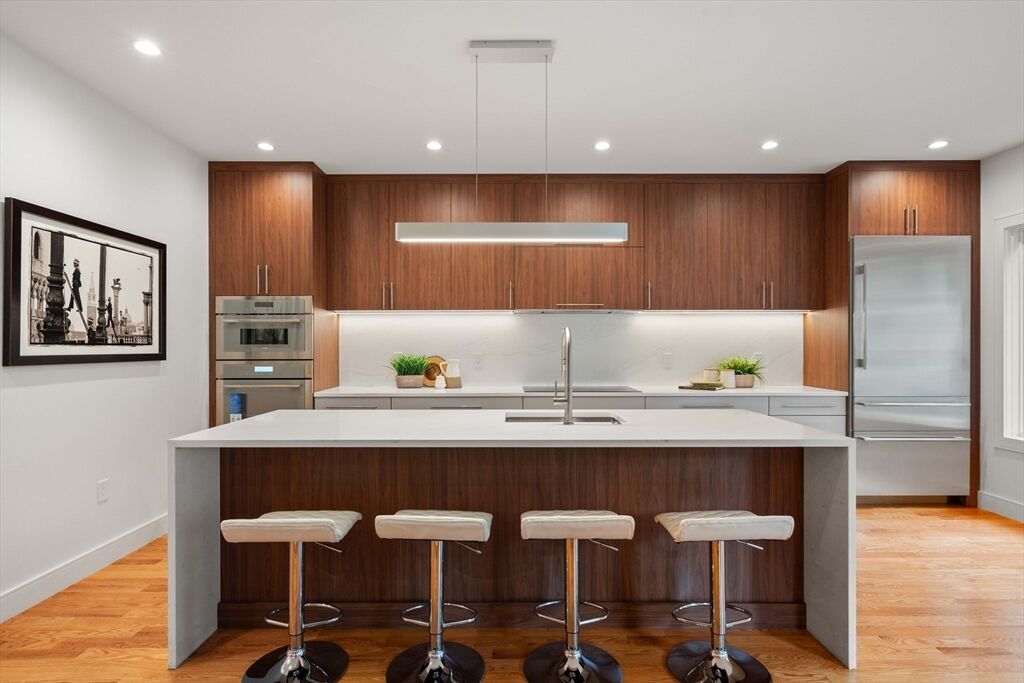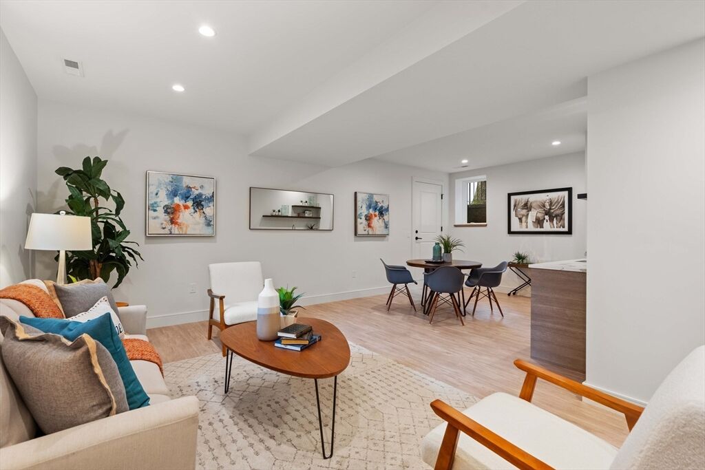 Exceptional new construction single family attached residence in Newtonville! 5 bedrooms, 4.5 bathrooms, and a fenced level lot. The open concept first floor has 9' ceilings, mudroom, living room, dining room, and custom gourmet kitchen with oversized island, powder room, direct access to the garage, patio and large yard. Floor two has a large primary bedroom suite with two walk-in closets, spa bathroom with soaking tub, large shower and heated floor, and 2 additional bedrooms, a dual vanity bath with tub, and a laundry room. The top floor features two additional bedrooms and full bath. The lower level has a large family room/flex space with wet bar and full bath. With approx.3,650 square feet of interior space, this home has hardwood floors, Marvin windows and doors, Thermador appliances, custom cabinetry. Beautifully designed functional space. Close to top schools, MBTA station, shops, restaurants.