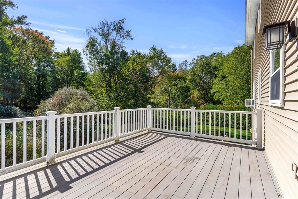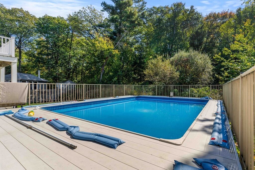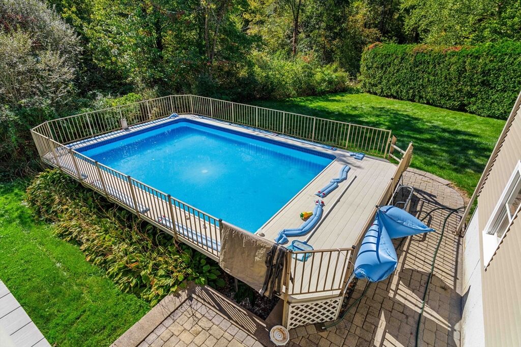 Situated at the end of Royal Crest Circle, a cul-de-sac side street, this prime location offers quick access to Rt. 93, making it one of the town's most sought-after spots. This 3-bedroom, 2.5-bath home boasts 2,147 sqft of living space. The expansive eat-in kitchen features granite countertops, recessed lighting, and direct access to a low-maintenance deck, ideal for grilling. It flows into a formal dining room with hardwood floors. The spacious front-to-back living room, ideal for lounging, easily fits a home office area. A full bath completes the first floor. Upstairs, three generous bedrooms feature hardwood floors; the primary includes vaulted ceilings, a walk-in closet, and direct access to a full bath with an oversized tub, tiled shower, and dual vanity. The finished lower level offers a large family room with recessed lights, tile flooring, and a half bath. Enjoy the above-ground pool and patio for outdoor entertainment in the summer months. Incredible value at this price!