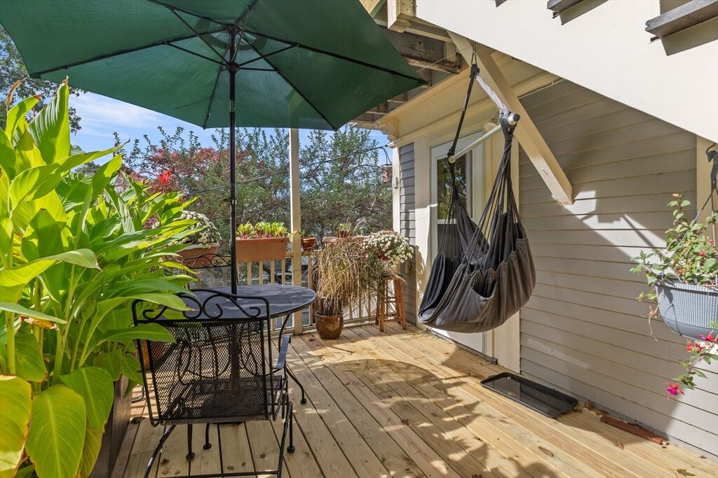 Iconic Queen Ann Victorian, converted into condos in 1995, has commanding views of Rockport Village and Sandy Bay. This second level unit features large oversized windows offering tons of natural light, beautiful wood flooring, original period details and soaring ceilings. The kitchen has been recently renovated with wood countertops and new stainless steel appliances and has a room for a breakfast bar or small table. The living room has wonderful natural lighting and beautiful hardwood floors. The bedroom is very spacious with a sizable closet. The full bath has been updated with a tiled bath and floor. This unit has its own private deck and access to a common third floor roof top deck with seasonal distant water views. The property is on a sizable lot with lots of yard space for relaxing or gardens. The exterior garden shed is shared by the association.Parking for 1 cars. You cannot beat the location! Only 1/2 mile to Rockport Village shops, restaurants & beaches. Don't miss out!
