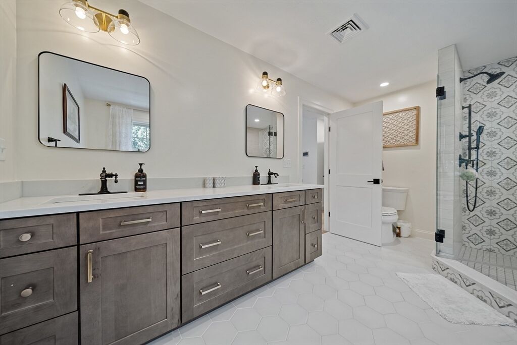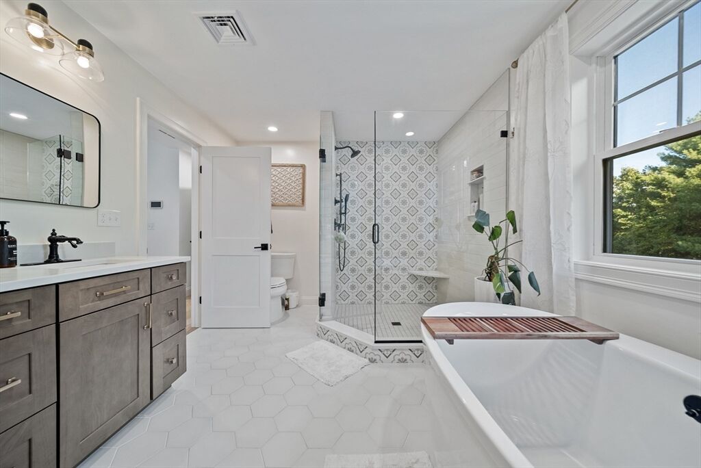 This one-of-a-kind custom colonial offers over 3,300 sq ft of luxury living with over $250K in high-end upgrades. The main level features an open-concept layout with sun-drenched living spaces, a chef’s kitchen with 8-ft quartz island, stainless appliances, and seamless flow to the back deck and fenced yard. Upstairs, the vaulted-ceiling primary suite includes a spa-like bath and custom walk-in closet, with two additional bedrooms and full bath. The fully finished walk-out lower level adds bonus living space, a 3rd full bath, and a second laundry zone. Full spray foam insulation, leased solar panels, and water filtration provide comfort and efficiency. Located on a lush, half-acre lot abutting conservation land and walking paths, just minutes to Newburyport, commuter routes, and beaches.