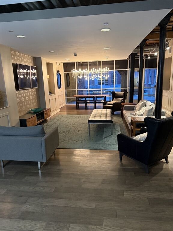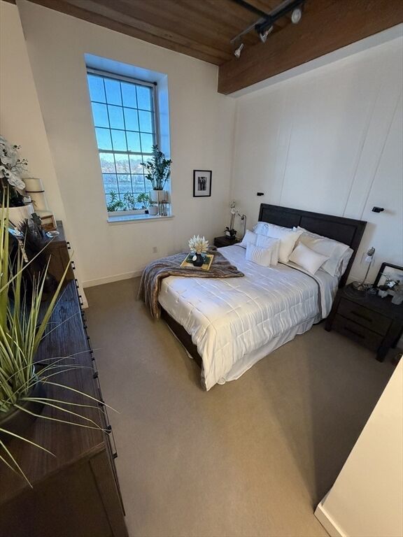 Experience refined urban living in this stunning waterfront loft at Boott Mills, positioned in Downtown Lowell’s National Historical Park. This masterfully designed one-bedroom residence harmonizes historic industrial character with modern luxury, showcasing soaring 14-foot ceilings, original timber beams, and exposed brick walls framed by oversized 7-foot windows that offer sweeping city views. The seamless open-concept layout integrates the living, dining, and kitchen areas, featuring a chef-inspired kitchen with granite countertops, a center island, and premium stainless-steel appliances. Enhanced by contemporary track lighting and the convenience of an in-unit full-size washer and dryer, this home provides an elevated lifestyle supported by amenities, including a scenic rooftop observation deck, an inviting outdoor patio, a fitness center, and a sophisticated lounge & game room for entertainment. Offering unparalleled connectivity to Routes 3, 495, and 93.