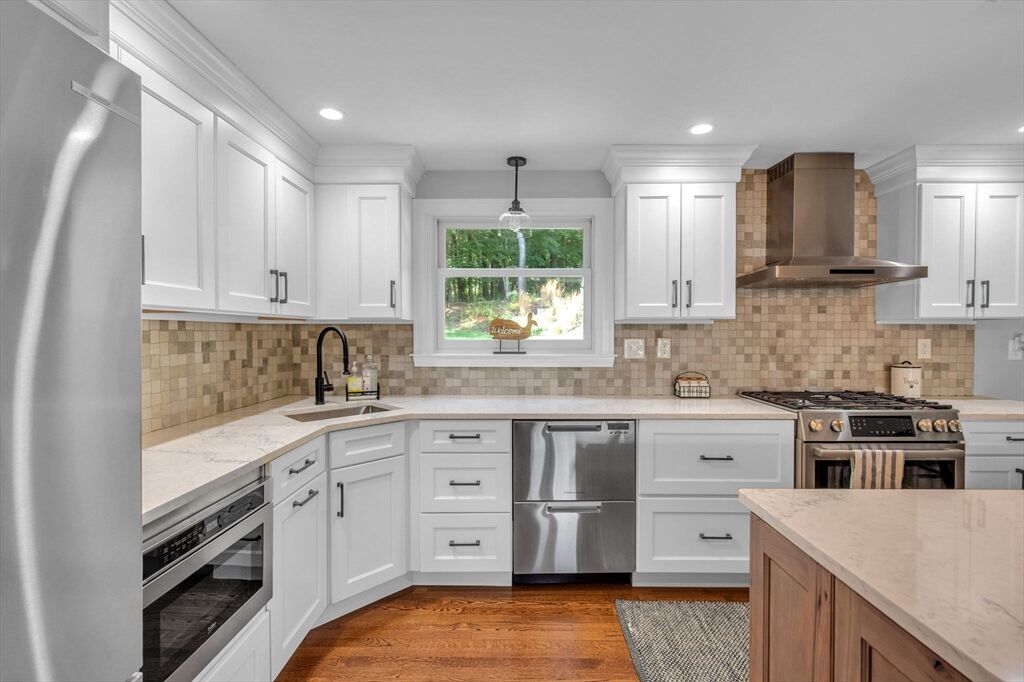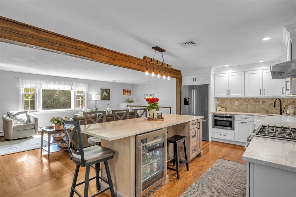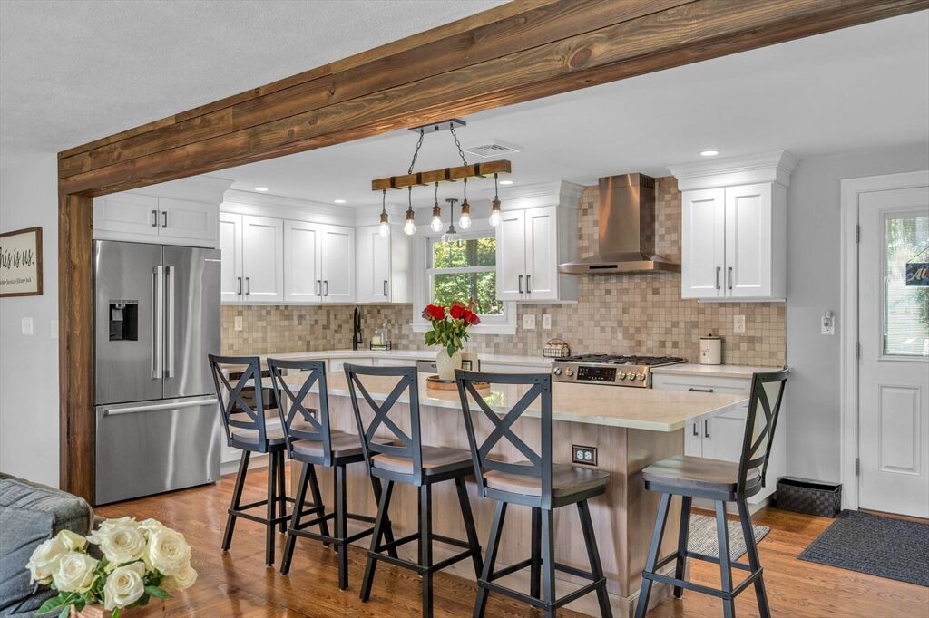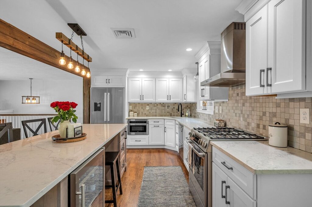This is the home you have been waiting for! Located on one of Pembroke's prettiest streets, this 3 bedroom raised ranch has set the bar very high for well maintained homes. The main level features a stunning new kitchen w/custom cabinets, large center island, built-in coffee bar, designed for function & entertainment. It could easily be featured on any home design website! This gorgeous space opens to the large family room with fireplace, hardwood floors, & abundant natural light. A primary suite with hardwood floors also includes a renovated private bath. 2 additional bedrooms & another renovated bathroom complete the main level. Downstairs the bonus room serves as a game room & family room. On the exterior the house has undergone significant updates over the years including new siding, windows, roof, and driveway updates. But the biggest project was a complete overhaul of the landscaping! **Multiple offers Deadline Sunday at 5pm.***