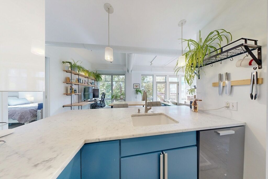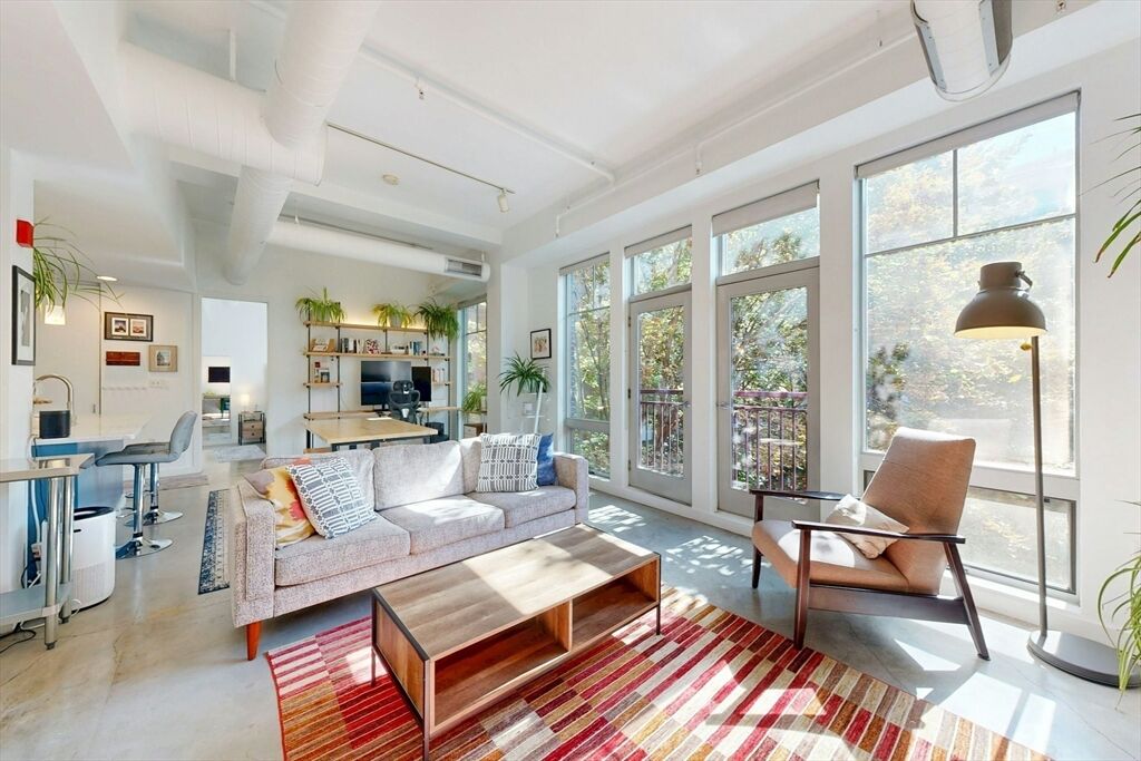 The impressive wall of 10 ft floor-to-ceiling windows creates an immediate wow factor upon entering this loft style one bedroom condo! Polished concrete floors and exposed ductwork throughout boasts an industrial chic aesthetic perfectly blending style and functionality. Separate bedroom and several custom designed closets throughout provides ample storage possibilities. Modern kitchen with granite counter tops and stainless steel appliances. Sleek bathroom with soaking tub. Built in custom designed maple desk and shelving. Washer dryer in unit. Central AC. Elevator access to common roof deck with sweeping city views. Deeded (separately) garage spot with additional storage at 35 Fay st. Close proximity to public transportation, whole foods, restaurants, parks, and much more. Dover Lofts provides its residents with SOWA living at its finest!