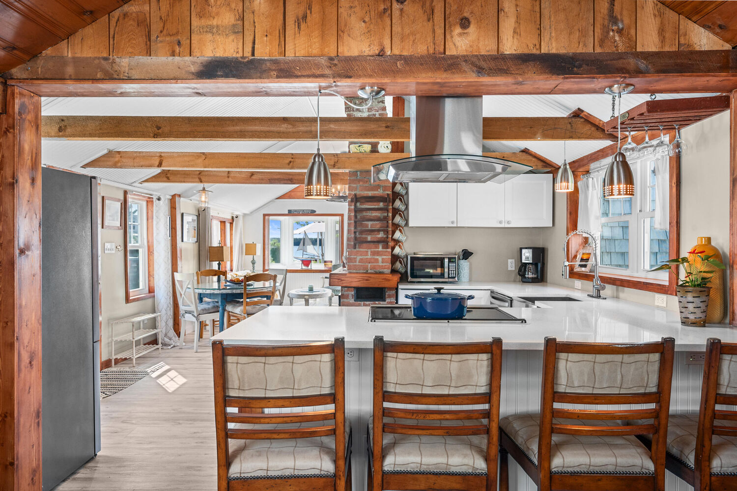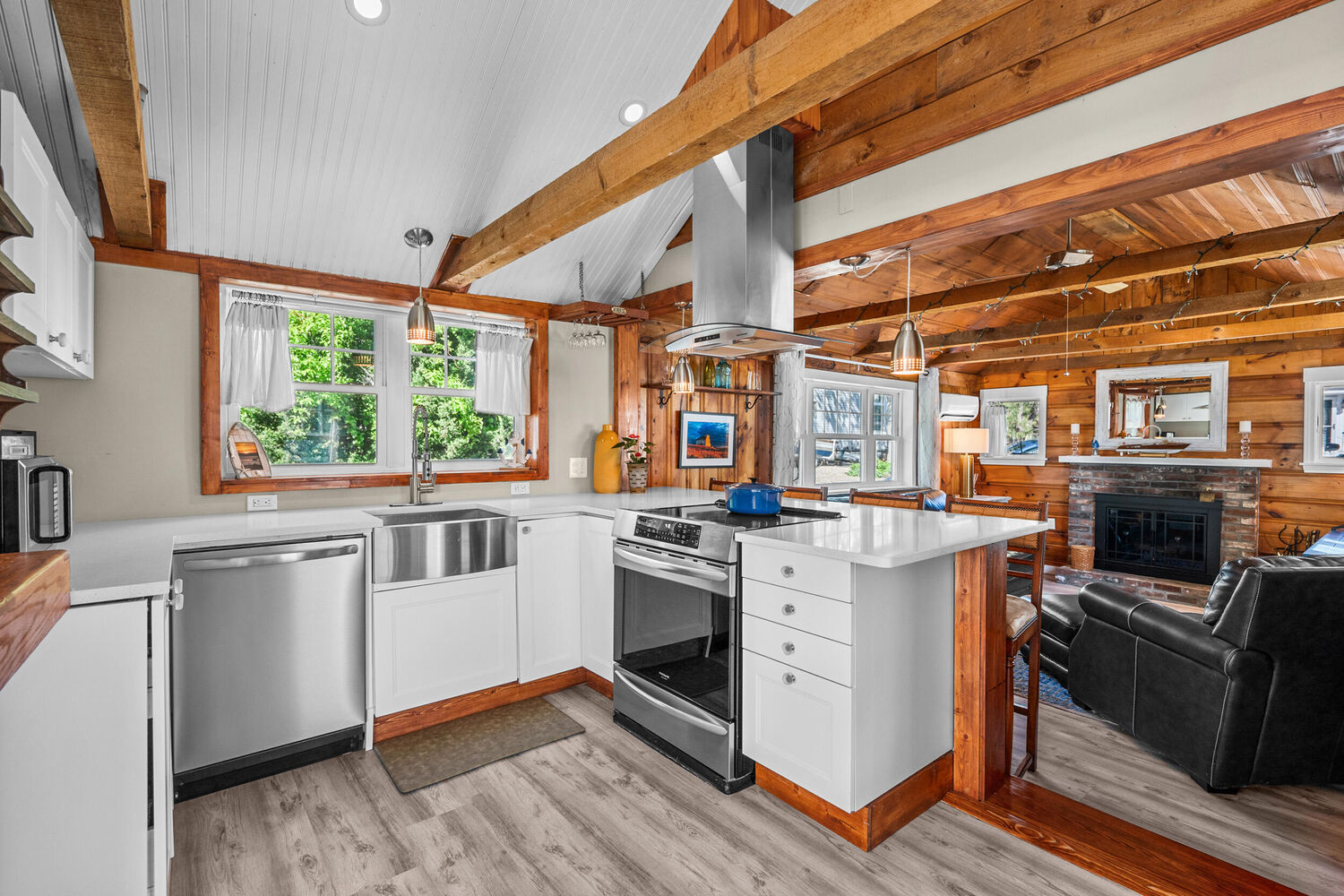 | Kitchen Features | 0X0 Countertop(s): Quartz Flooring: Laminate Stove(s): Other Kitchen View Beamed Ceilings Breakfast Bar Cathedral Ceiling(s) Kitchen Island Recessed Lighting |