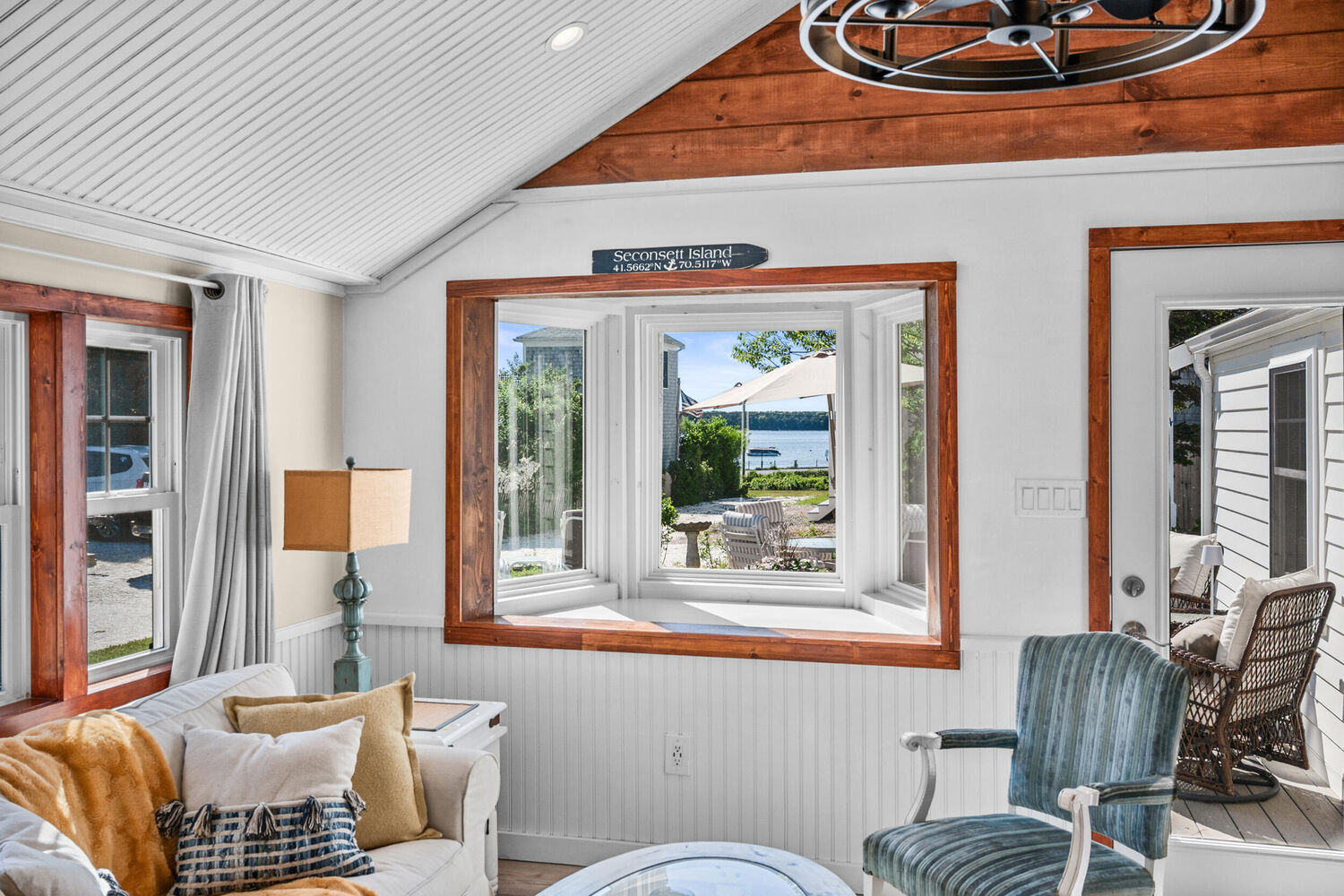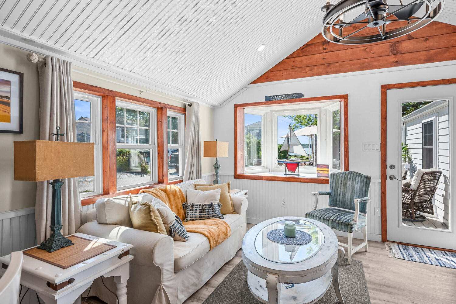 Discover unparalleled serenity at 14 Bayview Road, a beautifully renovated home nestled on the exclusive Seconsett Island. This exquisite beach house offers the perfect blend of modern comforts and classic Cape Cod charm, all set within a picturesque waterfront community.As you step inside, be captivated by the sweeping cathedral ceilings that grace every room, enhancing the sense of space and light. Both the Living room and family room are anchored by two inviting wood-burning fireplaces, creating a warm and welcoming atmosphere for quiet evenings or entertaining guests. Seamlessly integrated, the newer high-efficiency heating and air conditioning systems ensure year-round comfort. Step outside to your private outdoor space, where breathtaking views of Waquoit Bay unfold before you. This idyllic vantage point makes for a perfect backdrop to unwind or entertain, adding a touch of elegance to everyday life. Beyond your doorstep, the charm of Seconsett Island awaits tranquil escape with only a few small streets. Enjoy a quick stroll to the nearby Seconsett Island Beach and Little River Boat Yard. The sunsets from the house create a portrait every night that never gets old.