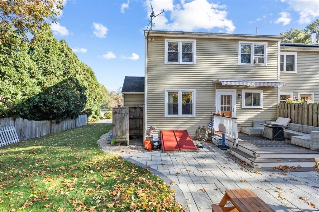 Welcome home to this beautifully maintained duplex (NO CONDO FEES) nestled in the highly desirable Manomet location. Bathed in tons of natural sunlight, this incredible home offers 3 spacious bedrooms, 2 full baths, and a versatile first-floor den with a closet that can easily serve as a fourth bedroom or home office. A long private driveway leads you to this inviting residence, showcasing pride of ownership at every turn. Inside, you’ll find gleaming hardwood floors, an updated kitchen with modern finishes, and a warm, inviting living room featuring a beautiful built-in electric fireplace—perfect for relaxing or entertaining. Upstairs boasts 3 large bedrooms, providing ample space for family and guests. Step outside to your own private oasis, complete with a fenced-in backyard, outdoor shower, and an incredible custom stone patio with compass inlay, ideal for outdoor dining and summer gatherings. Located close to area beaches, the marina, downtown Plymouth, shopping, and Cape Cod.