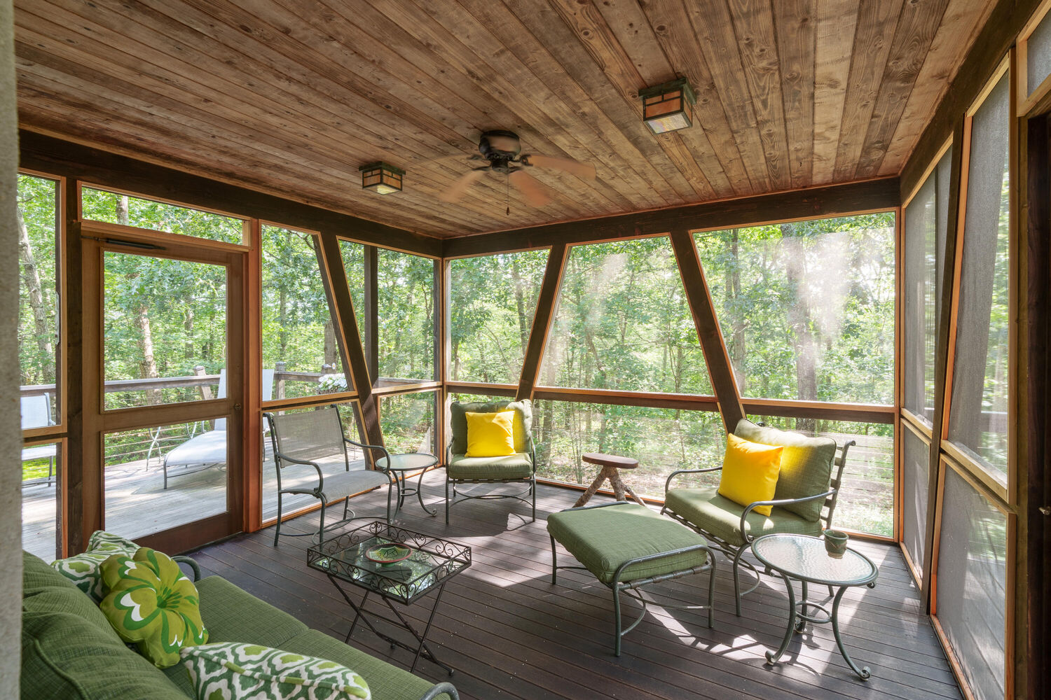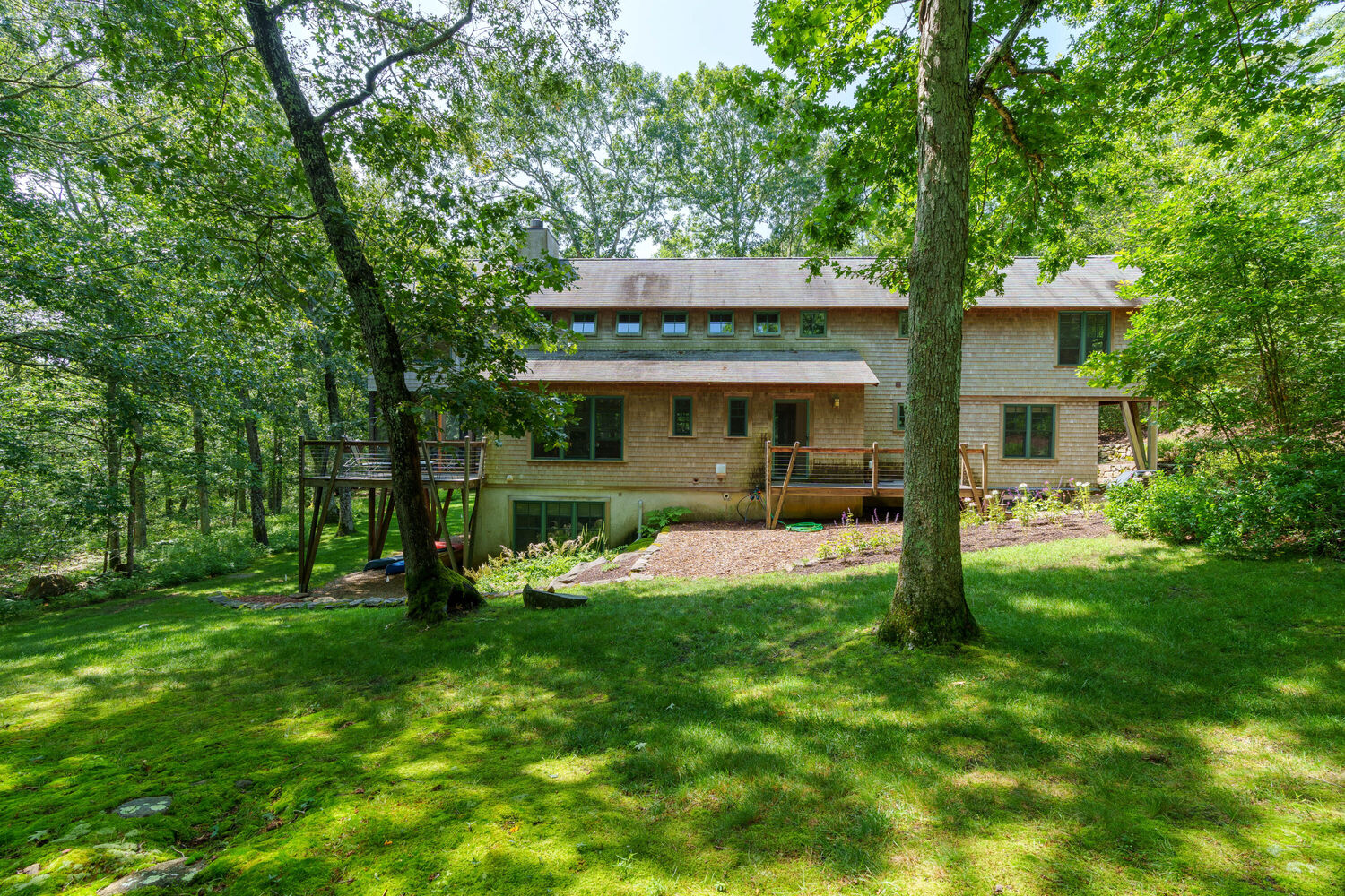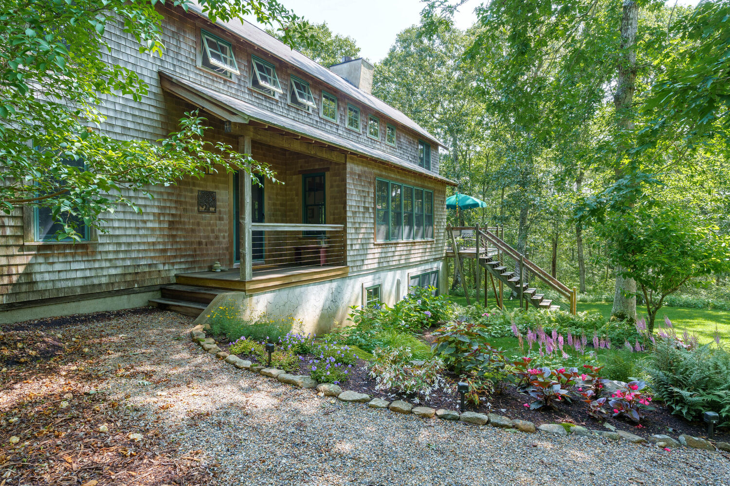 Affectionately referred to as 'The Treehouse', this property encompasses all the elements of a modern, sophisticated residence while providing the warmth and comfort of a private retreat. Professionally designed by Hutker Architects, this four-bedroom home, with a den/potential fifth bedroom, is sited in a private area, conveniently located with easy access to grocery store, pharmacy, and post office, and also to the island's most beautiful beach at Lambert's Cove. This home boasts meticulous attention to detail and exceptional craftsmanship. From the moment you step foot inside, you will notice the open floor plan design that creates a spacious and inviting atmosphere. Each of the four bedrooms has been thoughtfully designed and appointed to provide maximum comfort and privacy. The primary bedroom and ensuite bath and the den are at each end of the upper level, joined by a walkway across the living space. The main level also features a bedroom with ensuite bath, in addition to the large, open kitchen/dining/living space. Two more light-filled bedrooms plus a shared hall bath are located on the above-ground lower level. This is a meticulously maintained home with an open floor plan that is both functional and aesthetically pleasing. The open concept design includes a wood burning fireplace in the living room and a wonderful screened porch with open decks on either side. A back deck includes an outdoor shower.