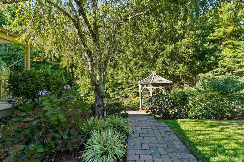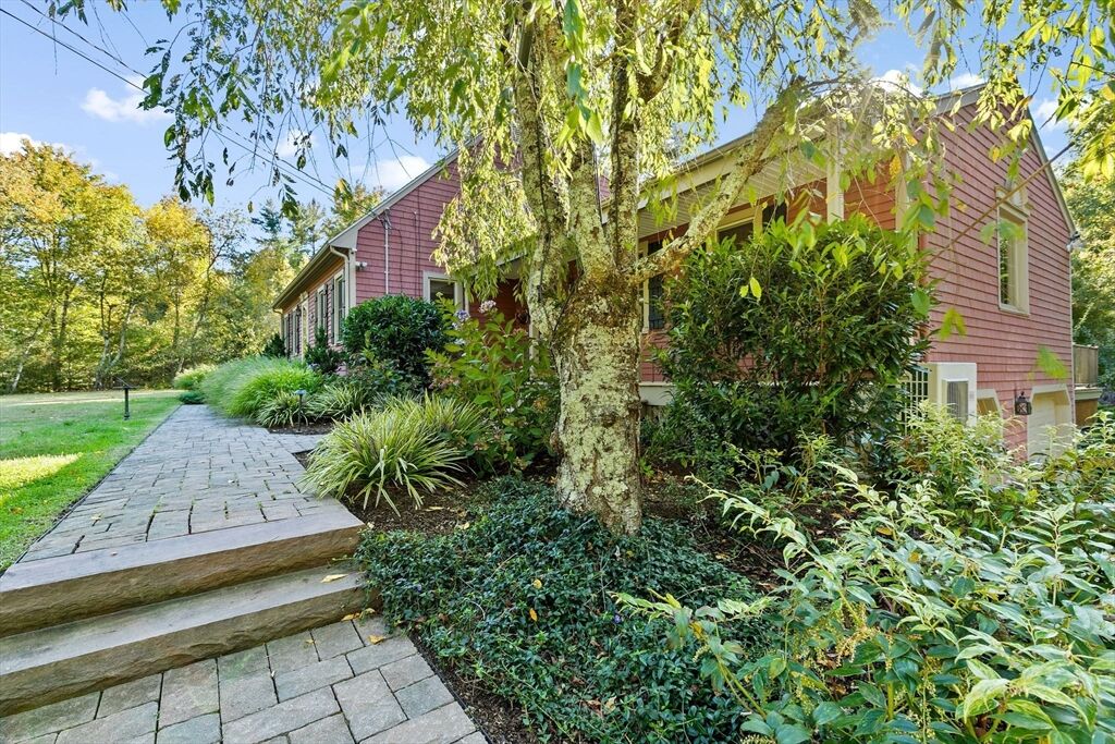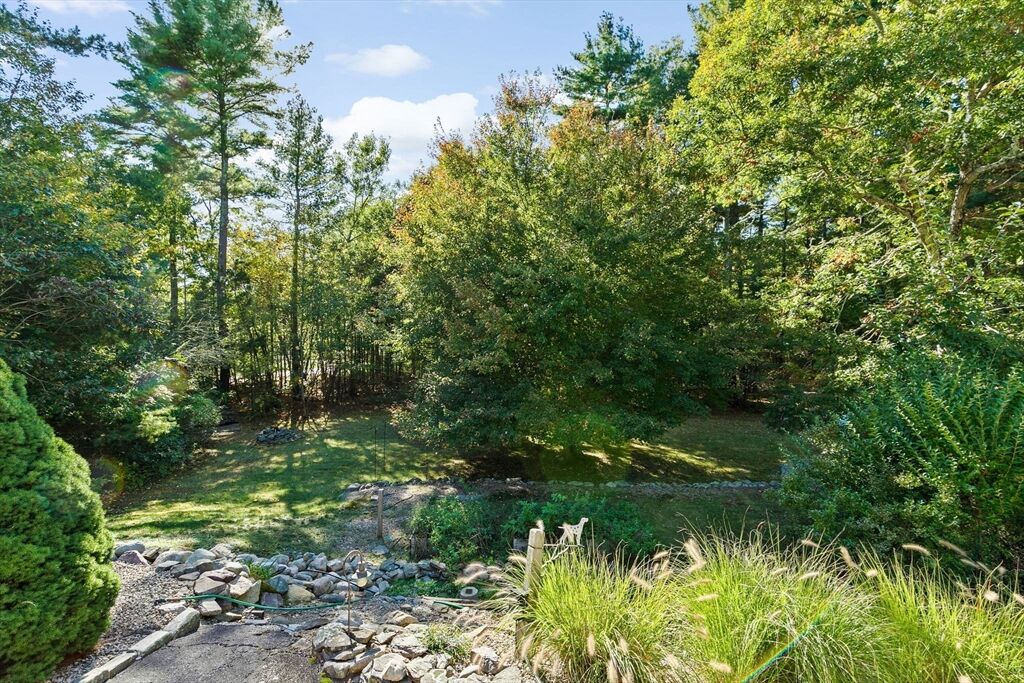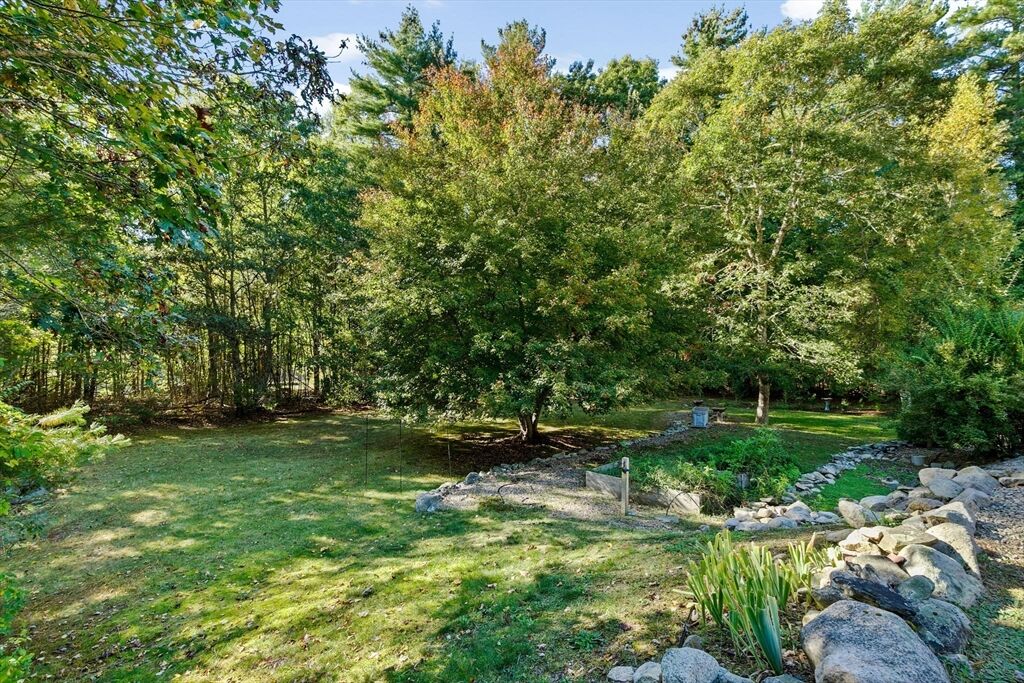 Situated between two communities, this corner lot home offers seclusion and peacefulness surrounded by trees and nature. The living room welcomes you with its rich wood vaulted ceiling, creating an atmosphere of spaciousness and warmth, all while the free-standing gas fireplace adds warmth and coziness instantly. French doors open to the covered deck overlooking the spacious secluded yard with mature landscaping. Imagine relaxing in this inviting space, where natural light dances across the unique architectural details. The kitchen delights in its custom designed island with maple butcher-block top, range hood and stovetop, stainless appliances, and stone countertops Bonus space in basement. So many additions: Culligan water treatment system, irrigation, Aerus central vacuum, Hot Springs Salt Spa, built in bedroom cabinetry. Lots of storage throughout. Six miles to the major shopping center, a short distance to Rte. 495 and 195. Town beach rights to Silvershell Beach 10 miles away.