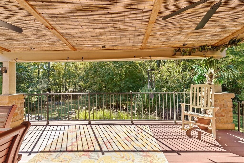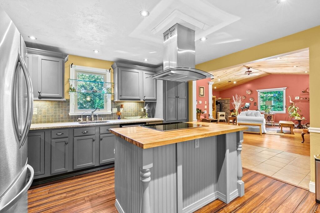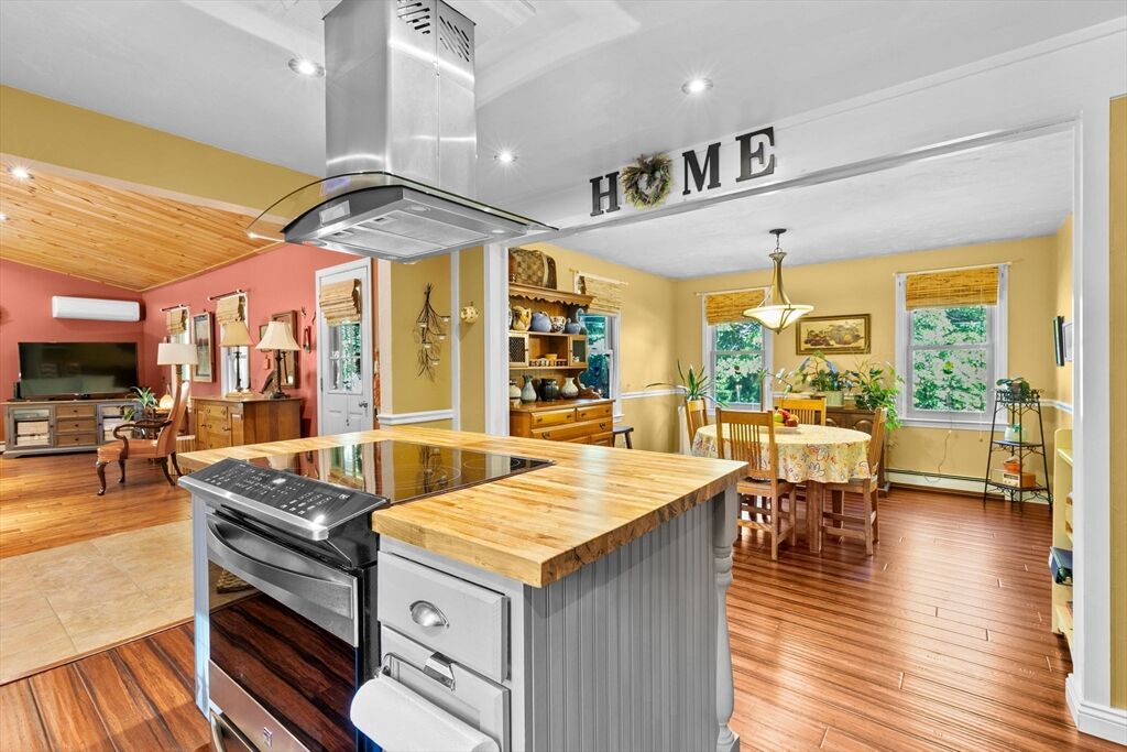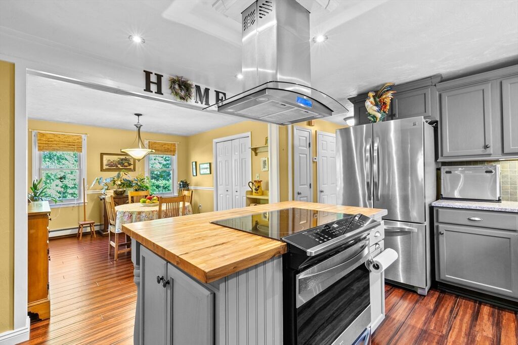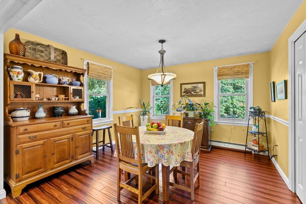Situated between two communities, this corner lot home offers seclusion and peacefulness surrounded by trees and nature. The living room welcomes you with its rich wood vaulted ceiling, creating an atmosphere of spaciousness and warmth, all while the free-standing gas fireplace adds warmth and coziness instantly. French doors open to the covered deck overlooking the spacious secluded yard with mature landscaping. Imagine relaxing in this inviting space, where natural light dances across the unique architectural details. The kitchen delights in its custom designed island with maple butcher-block top, range hood and stovetop, stainless appliances, and stone countertops Bonus space in basement. So many additions: Culligan water treatment system, irrigation, Aerus central vacuum, Hot Springs Salt Spa, built in bedroom cabinetry. Lots of storage throughout. Six miles to the major shopping center, a short distance to Rte. 495 and 195. Town beach rights to Silvershell Beach 10 miles away.