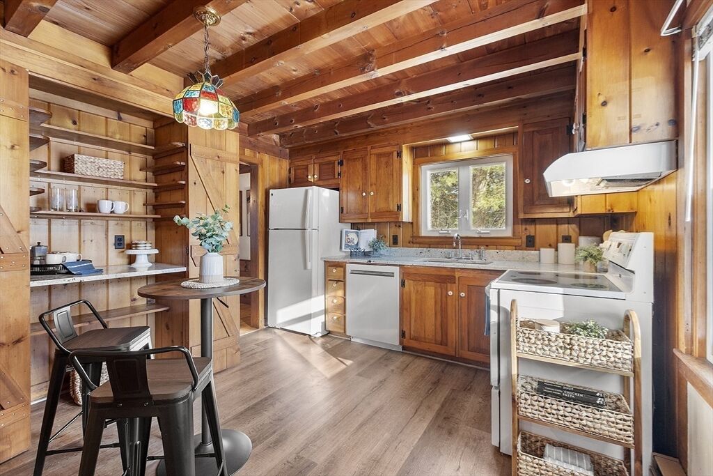 This charming saltbox-style home offers space, comfort, and endless possibilities. Wide plank floors and exposed beams create warmth, while its location at the end of a quiet cul-de-sac provides peace and privacy. The dining and living rooms, anchored by a wood stove, are perfect for gatherings, and the country kitchen features granite countertops and a custom pantry. A first-floor bedroom with its own bath adds convenience. Upstairs, the primary bedroom has custom built-ins and an oversized closet, alongside a second spacious bedroom and a clawfoot bath. Above the garage, a full in-law apartment with its own kitchen, bath, laundry hookup, and private entrance provides versatile, functional space. The 2-car garage has built-in cabinets. Solar panels enhance energy efficiency. The basement adds a family room, office, workshop, and laundry, while a screened porch, fenced yard, and shed complete the home. Minutes to Groton, Ayer Center, shopping, and restaurants—this one has it all!