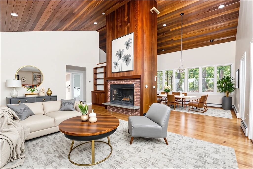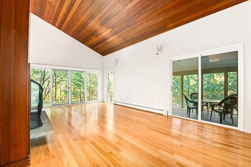 Privately set in a desirable Sherborn neighborhood, this 4-bedroom Contemporary offers the perfect blend of modern comfort and natural serenity. Surrounded by mature hemlocks and woodland views, this home provides a true sense of peace and privacy. Inside, vaulted ceilings and abundant windows fill the living spaces with natural light, creating a warm and inviting atmosphere. The spacious 1st FLOOR PRIMARY SUITE features a walk-in closet and a beautifully updated bath. The UPDATED CHEF'S KITCHEN features modern appliances, including a 6 burner GAS stove, and opens to the dining and living areas and flows to a screened porch—ideal for relaxing and enjoying the tranquil setting. Upstairs, three bedrooms and an updated bath offer comfortable space for family or guests. Nature lovers will appreciate the scenic surroundings and proximity to area amenities. Sherborn is known for its top-ranked schools. Seller providing $2,500 FLOORING CREDIT. Come see this lovely tranquil woodland retreat!