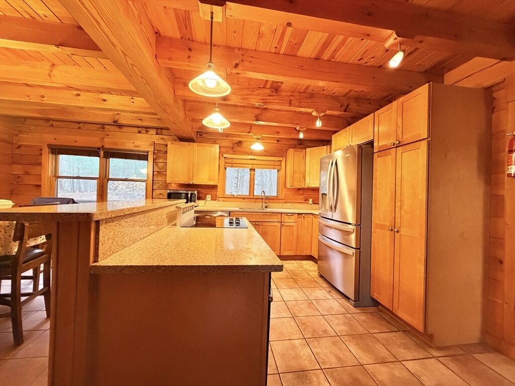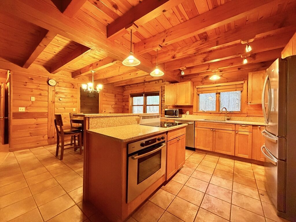 Quality materials used thru-out this custom designed home. you will find this spacious and inviting custom-built Log that has been lovingly maintained by the owners. True single-level living that offers 3 bedrooms and 2 baths (master bath) with 1st floor laundry and attached 2-car garage. Hydronic Floor Heat(Radiant), Wood Stove. One of the most beautiful towns in New England, this Well Maintained Log home is privately set 300' off the road on over 28 acres of land, complete with stonewalls, trails for hiking or ATV's and 610' of frontage. Nature & wildlife, a mile to Gate 43 of the Quabbin Reservoir. The moment you step inside of this home you feel warm and welcomed. The Sun filled Great Room with a Cathedral Ceiling, stone hearth and wood stove is open to the dining room and Gourmet kitchen that offers wood ceiling, a center island with breakfast bar and appliances to remain, the gorgeous custom built staircase leads to the loft with skylights.