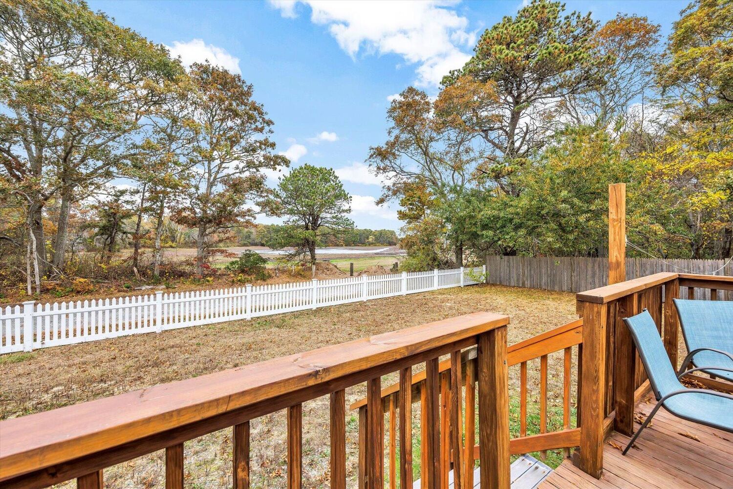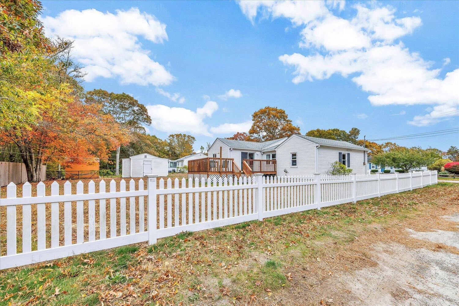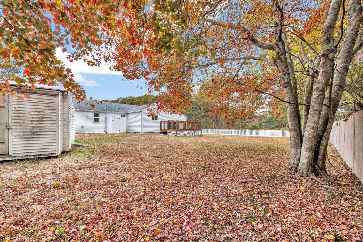 Fall in love with this well maintained 3-bedroom Ranch style home that is situated on a corner lot with tranquil views of the cranberry bog! It's conveniently located to shopping, restaurants, conservation trails, Swan Pond, Seagull Beach, and other entertainment amenities. With over 1,500 SQFT of living space, you will find lots of natural lighting, beautiful hardwood floors (recently refinished) and Lifeproof vinyl plank flooring, a wood burning fireplace with mantle, first flooring laundry, a large kitchen/dining room combo with exterior access to the deck, and a breezeway/foyer with its own entrance. The primary bedroom has 2 closets with a private full bath, the second bedroom has 3 closets (both bedrooms are spacious in size), and the third bedroom is smaller in size without a closet may be ideal for a guest bedroom or office space. Other home features include Central AC, recessed lighting throughout, renovated bathrooms, attic space for additional storage, interior access to a 1 car garage with a work bench area, a 10x12 shed, front and back irrigation, outdoor shower, partially fenced in yard, and vinyl siding for easy exterior maintenance.