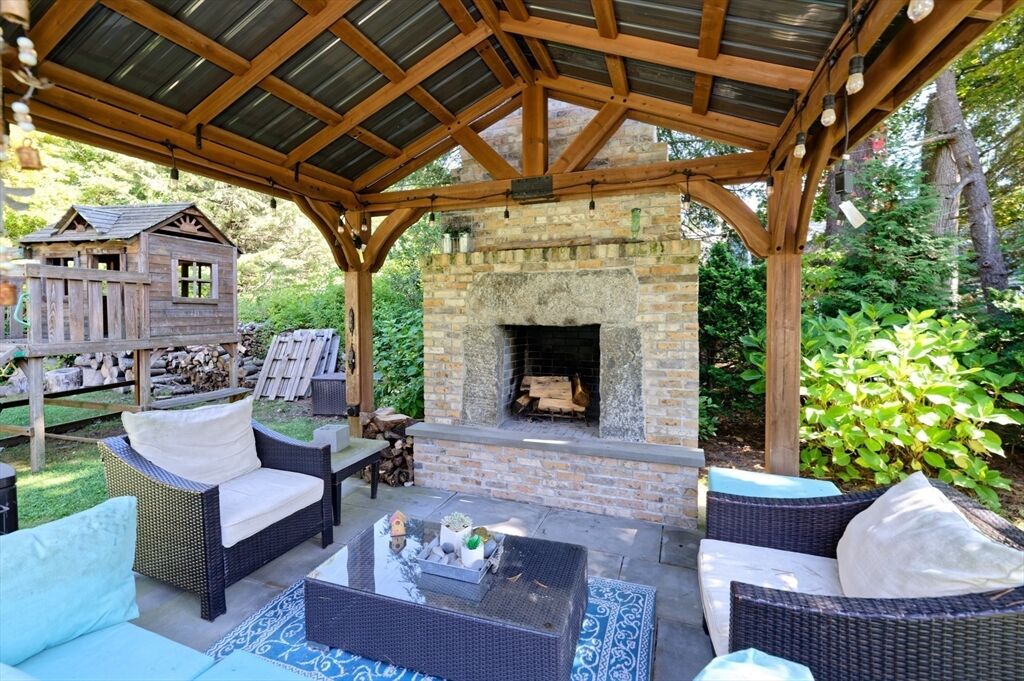 Discover this exceptional contemporary colonial with a fully covered rear patio, two fireplaces, and a beautifully landscaped yard complete with shed, chicken coop, and a second covered fireplaced patio. The first floor offers an open layout with spacious living and dining rooms, a kitchen with island, full bath, and cozy den. Upstairs, enjoy a front-to-back primary bedroom, two additional large bedrooms, and a versatile family room that can serve as a fourth bedroom. The finished lower level boasts a great/game room with wet bar and walkout access. Outdoor living shines with a 28x30 kitchen featuring a stone pizza oven, wood-burning barbecue, and propane grill. Energy-efficient solar panels, a generator, and thoughtful upgrades make this home truly one-of-a-kind. Schedule your showing today!
