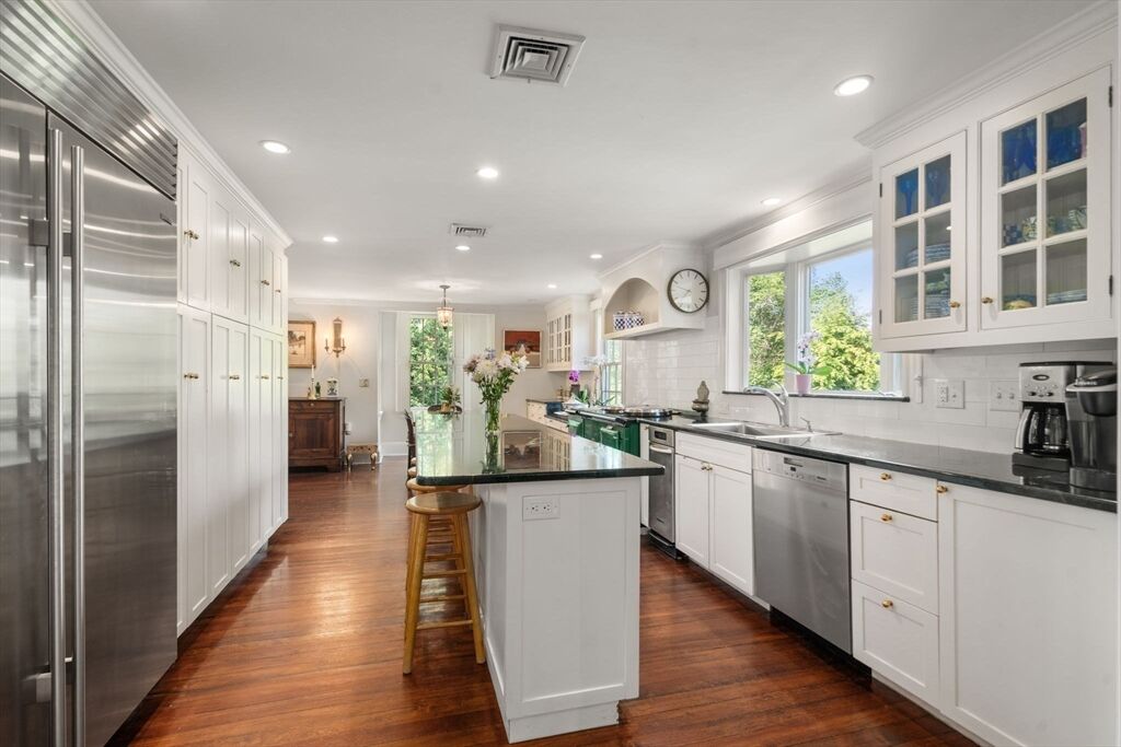Beautifully renovated and idyllically sited on approximately .78 private acres, this exceptional colonial offers spectacular views overlooking vast fields and meadows. Enjoy thoughtful updates and timeless charm throughout. Stunning gourmet kitchen with informal dining adjoins family area. Gracious dining room with fireplace, fabulous great room with soaring cathedral ceiling and fireplace, French doors open to patio with incredible views, ideal for seamless indoor-outdoor entertaining. Four bedrooms including primary suite with luxurious bath, laundry room and family bath complete second floor. Spacious lower level offers 5th bedroom with full bath, office and gym. A detached two car garage has finished bonus space above providing endless possibilities. Located in the heart of Weston close to Land’s Sake Farm, schools, recreation center, library and miles of conservation land. Offering serenity and convenience this location also provides easy access to Boston and major routes