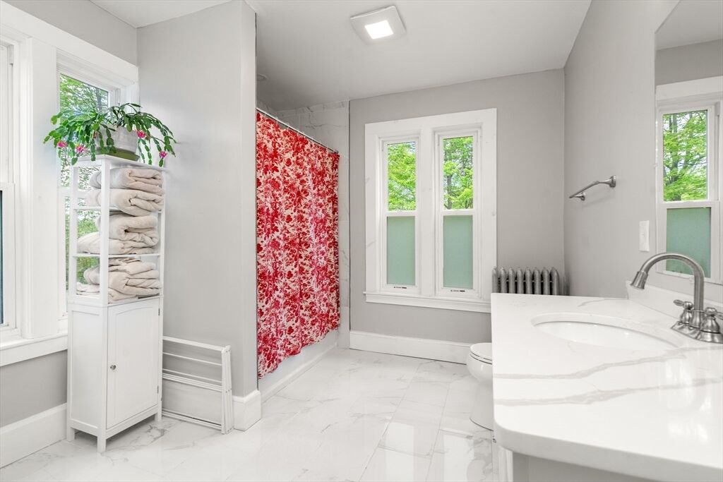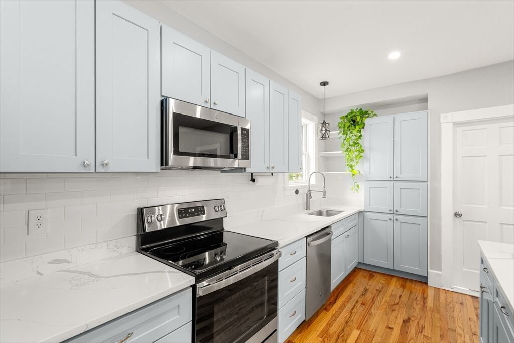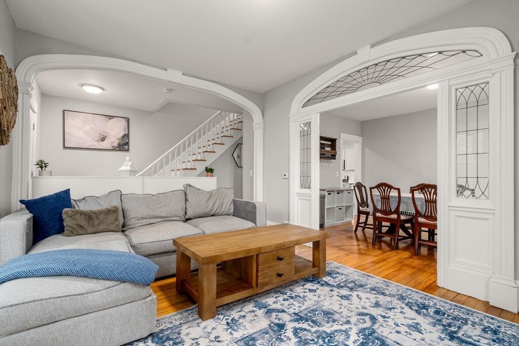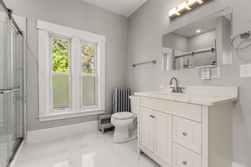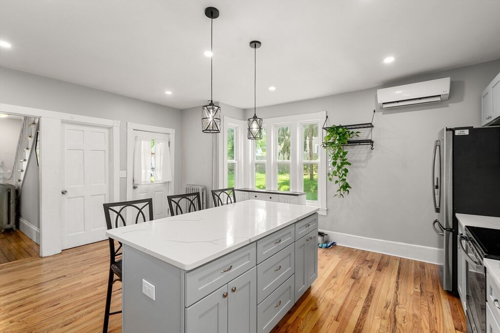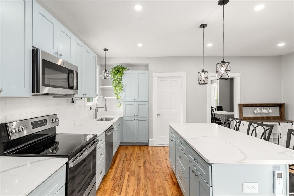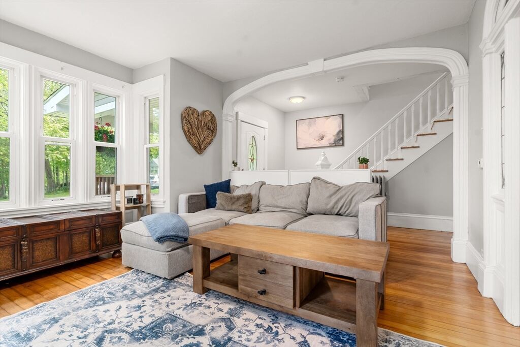 Step into this beautifully renovated home where timeless character meets modern updates. Carefully improved with newer windows, roof, and plumbing, the home retains its original charm throughout. Hardwood floors shine under abundant natural light streaming through oversized windows in every room. The main level offers a welcoming living and dining area, highlighted by a striking architectural doorway that sets this home apart. The kitchen blends style and function with quartz countertops, classic shaker cabinetry, a subway tile backsplash, and a spacious island perfect for gathering. Upstairs, a bright landing leads to three comfortable bedrooms, a full bath, and a cozy nook ideal for a study or reading space. Outside, enjoy warm fall evenings on the inviting farmer’s porch or host friends and family in the expansive backyard—perfect for gardening, play, or quiet evenings under the stars.