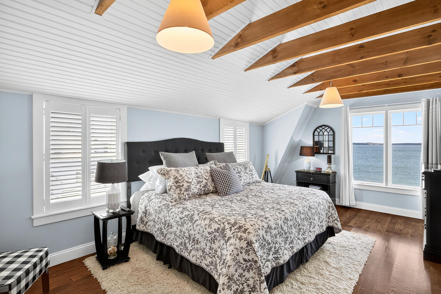 Bedroom | 0X0 Flooring: Wood View Closet Cathedral Ceiling(s) Beamed Ceilings |