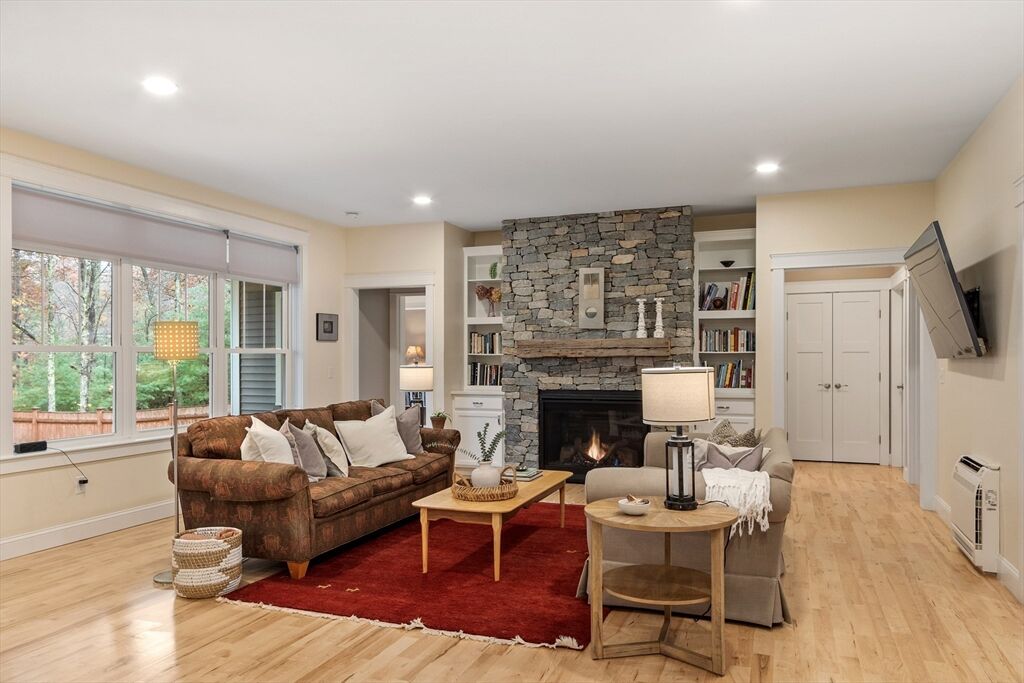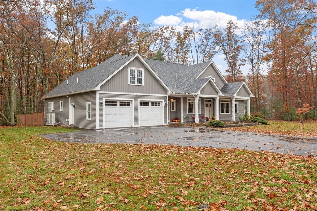Rare opportunity! This 6-year-young custom ranch blends quality craftsmanship, energy efficiency, and modern comfort on a quiet country road. The covered porch welcomes you into a spacious mudroom that opens to a bright, open-concept living area with gleaming hardwood floors, large windows, and a cozy gas fireplace.The chef’s kitchen features quartz countertops, custom cabinets, and a large island. Sunlit dining and living spaces flow seamlessly to a private fenced backyard with a patio—ideal for relaxing or entertaining. The main suite includes a walk-in closet and a spa-like bath with double vanity and quartz finishes. Three additional bedrooms offer large closets, and the 2nd full bath has double sinks and separate tub area. A two-car garage and expansive unfinished basement provide excellent storage and expansion potential. Updates include mini-split systems, owned solar panels, water filtration, and a backup generator. Convenient to Hudson Center, Highland Commons, and I-495/I-290