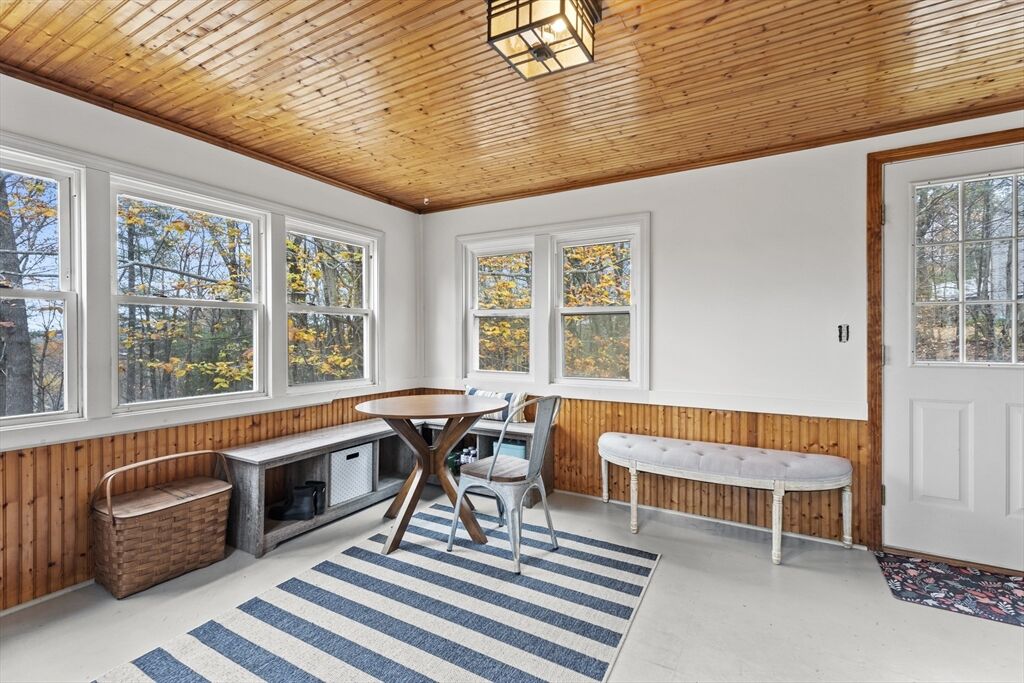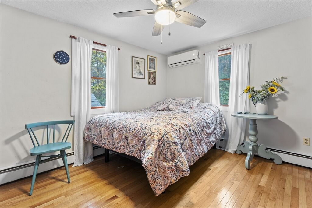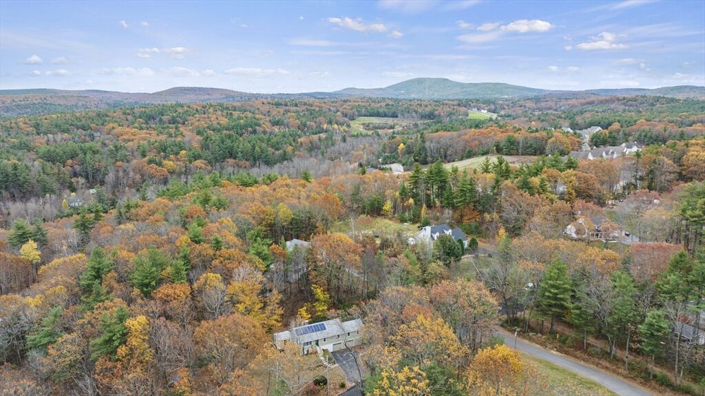 Spacious 3 bed 1 bath ranch with a private .78 acres, 2 car garage, & many updates! Single level living or utilize the partially finished basement area, flexible layout provides options with both levels. Enter into a spacious living room w/ cozy wood stove & oversized entry to kitchen area - beyond that is a heated three season room perfect for all the New England seasons, w/ exterior access. Hardwood floors thru living area & bedrooms all w/ great closet space. Ample sized bathroom w/ first floor laundry & double vanity. Primary bedroom has additional 8x8 office/closet/flex space. Partially finished basement can be used for additional living space & connects directly to left side garage stall, right side garage stall is accessed via exterior door. Commuter location w/ the MBTA, Route 2, 2A, 31, & 140 all just minutes away, tucked away but still close to local amenities. Roof 6 years old, solar (2020), electrical panel (2018), new water tank, new mini splits heat/ac (2025).