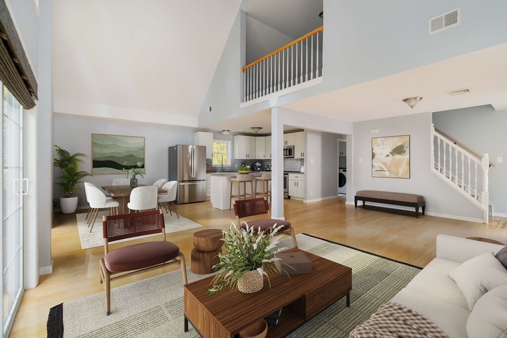 This is your ideal first home or effortless downsizing haven! Built in 2010, this move-in-ready gem eliminates the stress of renovations and is perfect for those craving simplicity without sacrificing style. An airy, open floor plan with gleaming wood floors is highlighted by the dramatic vaulted living room, with a soaring cathedral ceiling and a striking wall of windows framing tranquil views of the surrounding nature. Two spacious bedrooms on the first floor offer single-level living, while the upstairs offers a third bedroom plus a flex loft, perfect for remote work or guests. Outside, 1.5 acres of lush land abut conservation, creating your personal suburban sanctuary. A fully fenced yard invites safe play for little ones and pets, gardening, or evenings under the stars. Bedford schools, charming town center, shopping centers, and major commuter routes are just minutes away. This blend of 2010-built quality, move-in perfection, and natural privacy is rarely seen at this price.