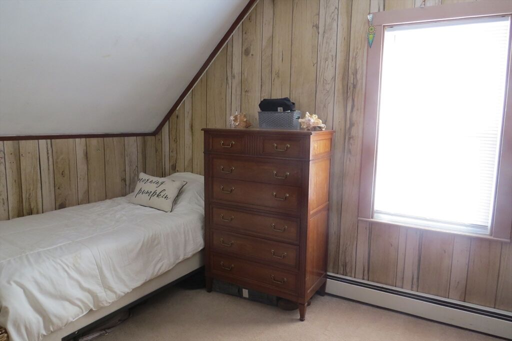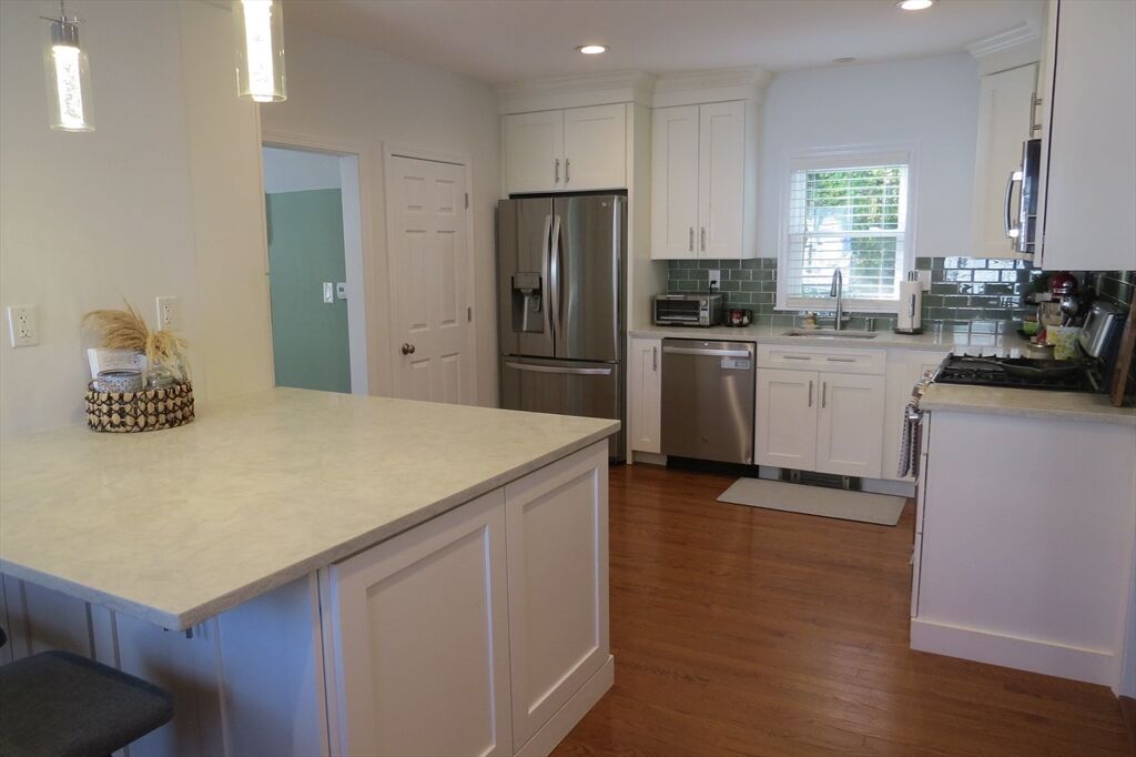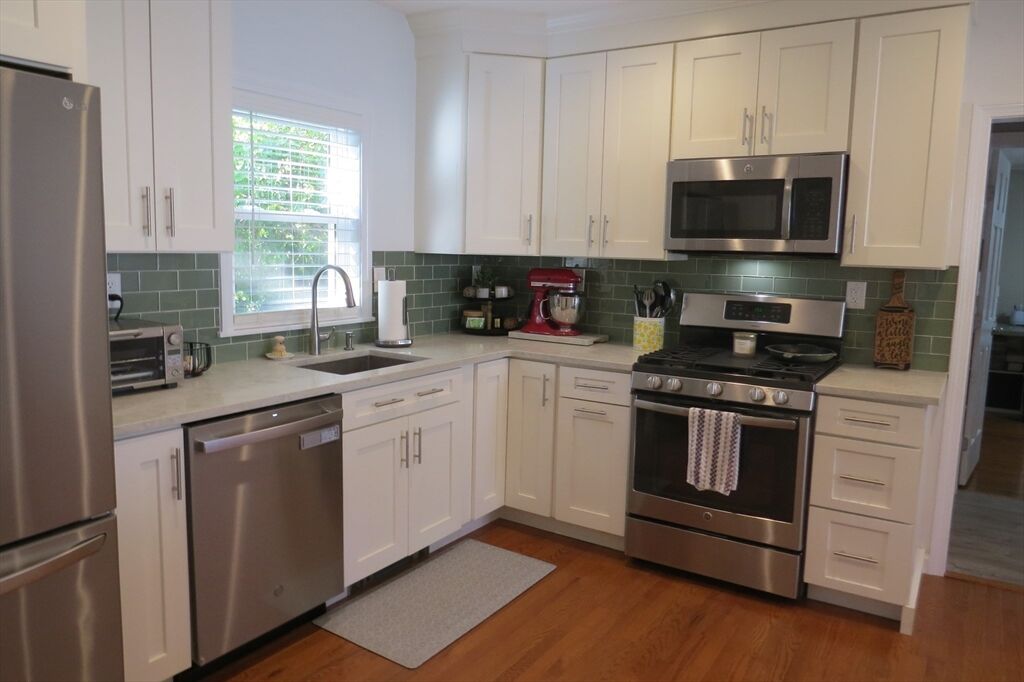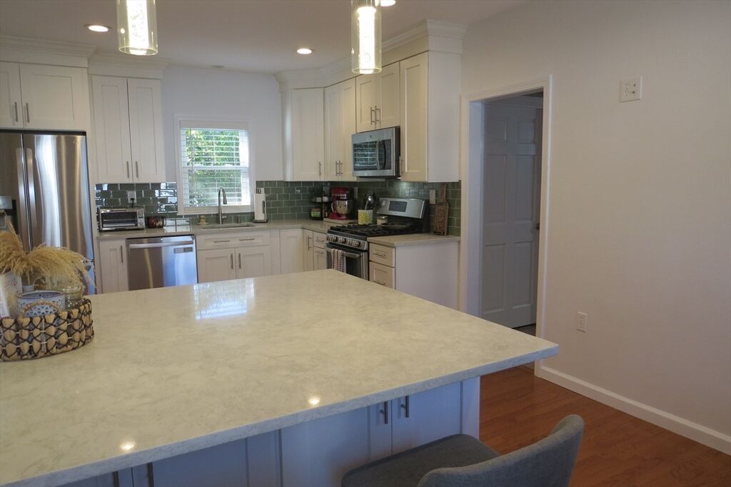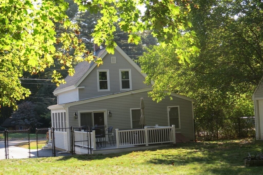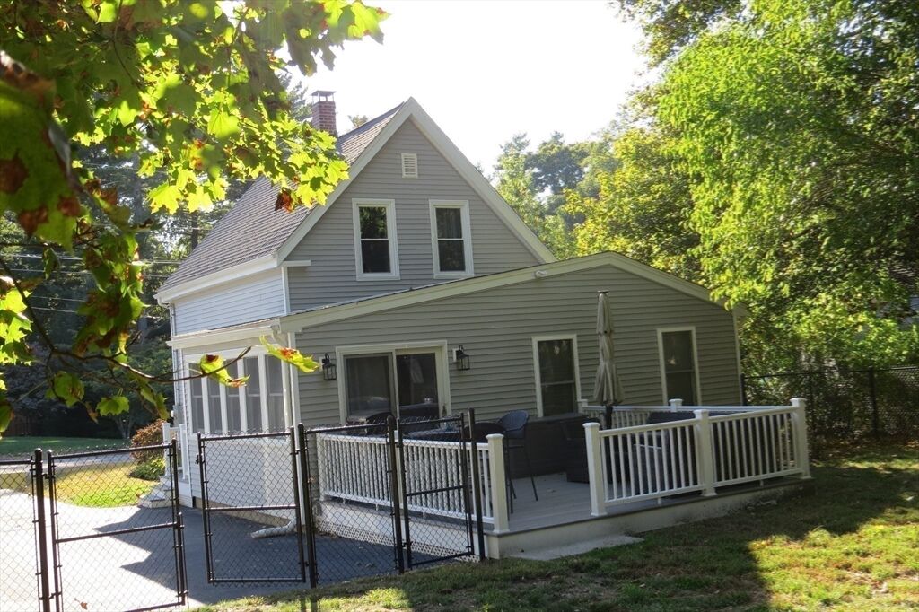 Welcome to this Thoughtfully Updated Farm house, Blending Timeless Charm with Modern Conveniences. The Home's Open Main Level is made for Everyday Living. Enter into the Charming living room which flows into the New Sunlit Kitchen Featuring a Giant Quartz Island and with an abundance of Cabinetry. The First Floor Bedroom , and the 3 Season Room offer many options with Sliders onto a Composite Deck Overlooking a Fenced -in , Wooded Back Yard. The Second floor offers two more Bedrooms. A brand new Oil fired Boiler was just Installed. There are so many updates-too much to list. Please see the Feature Sheet. The Commuter Rail is Located Just 4 Minutes away~ 1.3 miles. With Historic Character and Updated systems, this Home is ready for it new owner. Please Join us for the First Open House on Sunday October 12 11:30-1PM