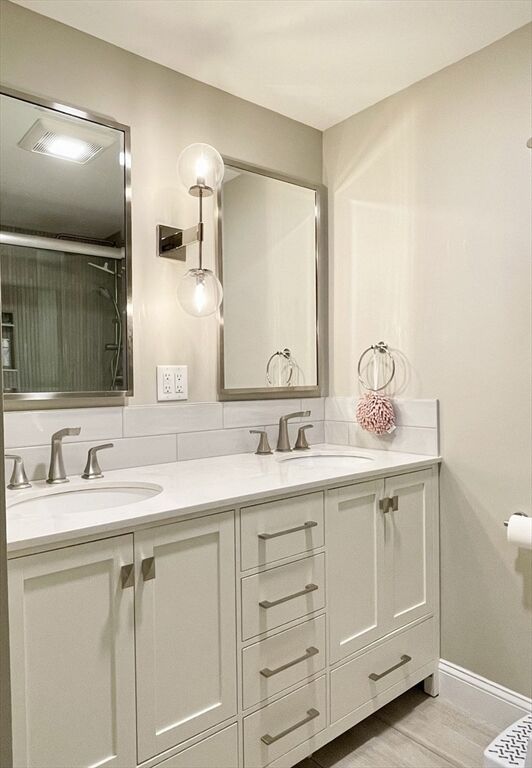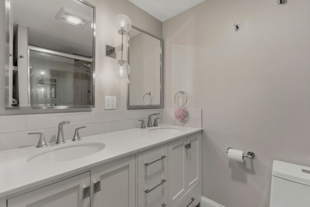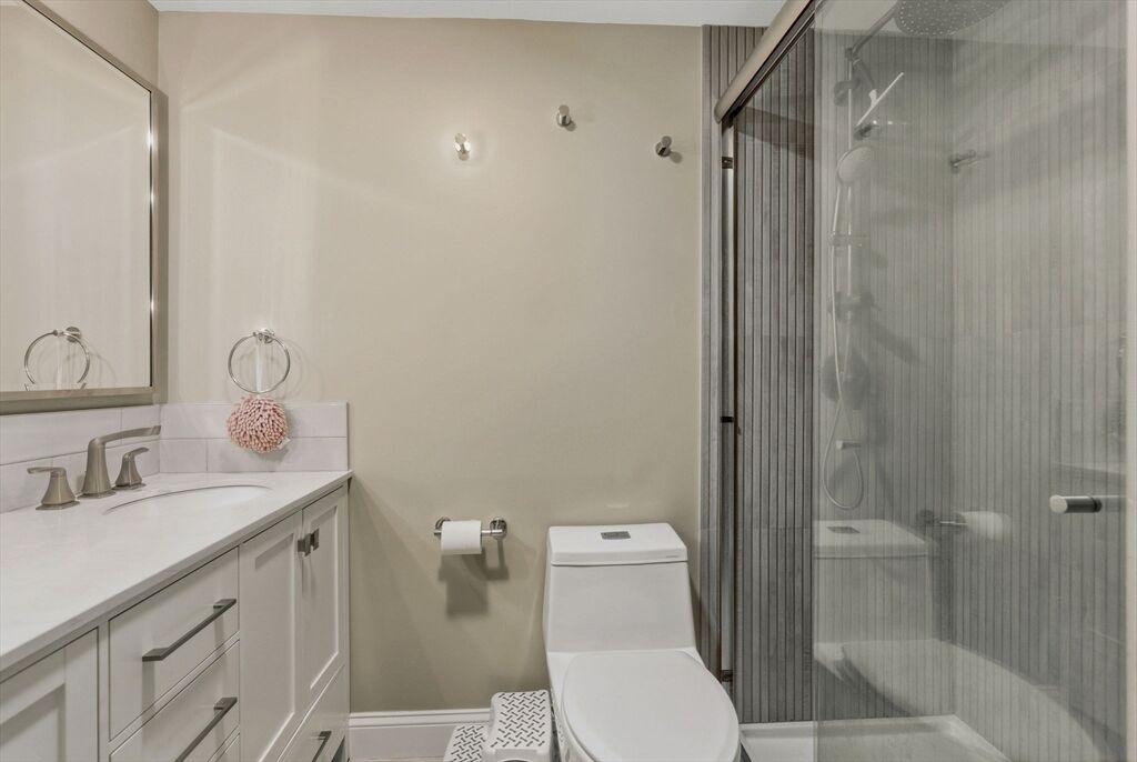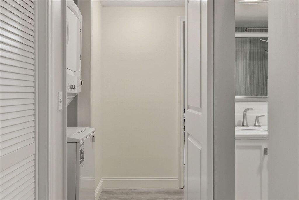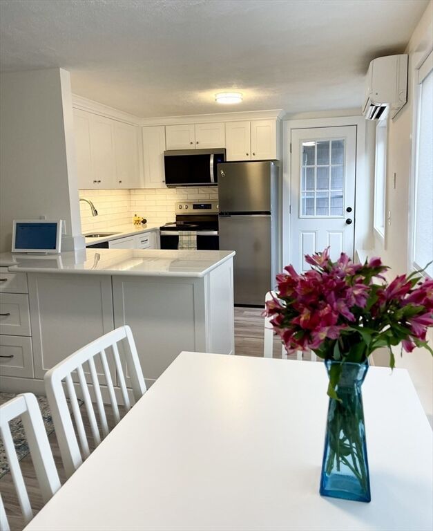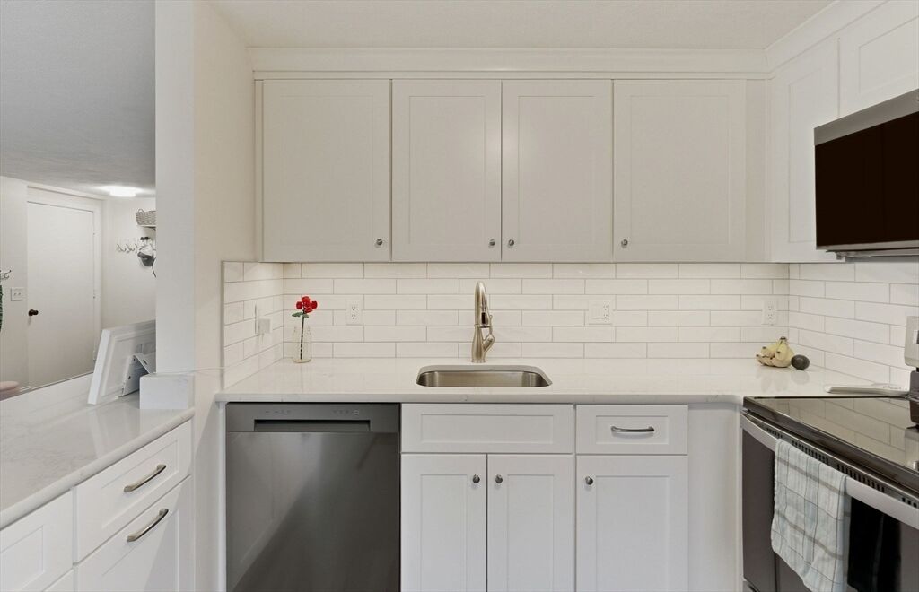 Beautifully renovated and move-in ready! 2 Bedroom, 1 Bath condo with a private patio and partial water views at popular Glen Devin on Lake Gardner in Amesbury. Fully updated since 2019 with a new kitchen featuring white quartz countertops with a peninsula which can accommodate 2 stools, stainless steel appliances, exterior vented over-the-range microwave, dining area with remote operated window shade. In-Unit stacked washer/dryer, bathroom with tiled shower and double vanity, large main bedroom with double closet, second bedroom and your own patio. 3 mini-splits were installed in 2020 and provide heat and AC. Amenities include a club house, post office, basketball hoop, kayak storage and lake access. Just over a mile away from downtown Amesbury - a bustling former mill town with an interesting assortment restaurants, breweries, shops, history and scenery. Open Houses: Friday, 5:30-7, Sat & Sun 12-2