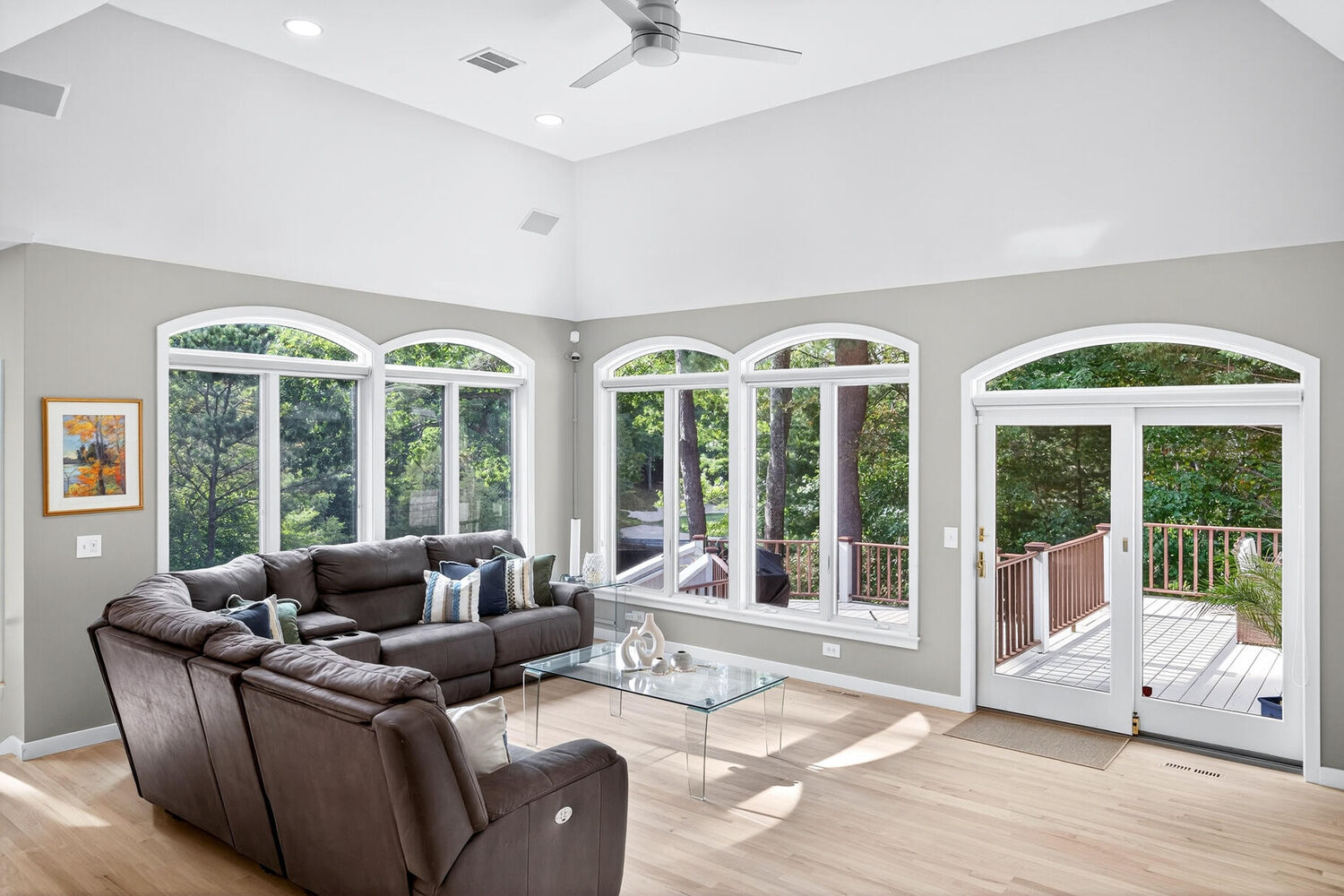 This architecturally designed home is sited to blend with the landscape and capture pond views and the manicured golf course beyond. Walls of glass and seamless access to the outdoors from nearly every room, the home immerses you in nature while offering the sophistication and comfort discerning buyers expect. An inviting foyer leads to a dramatic living room with soaring ceilings, gas fireplace, panoramic vistas. The chef's kitchen features top-line appliances, induction cooking, motorized Hunter Douglas shades and serene koi pond views. A versatile office with adjacent full bath accommodates today's work-from-home lifestyle. The primary suite is a retreat of its own-complete with sitting area, spa-like bath and tranquil water views. On the lower level, two guest bedrooms with private deck access, full bath plus another en-suite bedroom create the ideal setting for multi-generational living or extended guest stays. An oversized two-car garage and golf cart (included) complement the lifestyle. The Ridge Club is not just for golfers-there are social memberships for all age groups and fine dining at the Clubhouse. Experience refined living in this exclusive gated community.