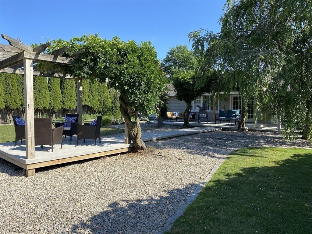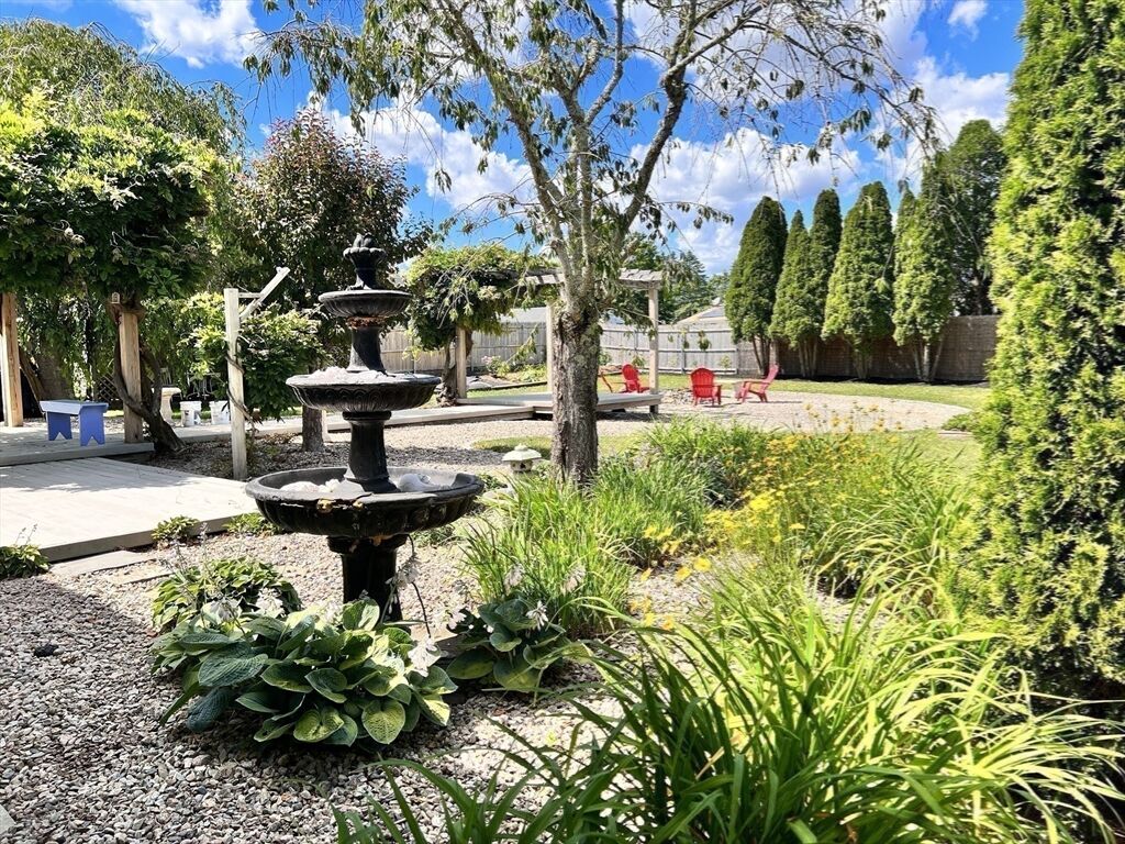 Welcome to 3 Mishawum Drive! This sun-filled 3-bedroom, 1-bath ranch in South Dartmouth offers custom charm just minutes from Padanaram village and local beaches. Inside, you'll find built-in bookshelves, wainscoting, and French doors in each bedroom opening to your private backyard oasis. The star of this home is the spectacular outdoor space that is perfect for entertaining or relaxation. An expansive composite deck features a wisteria-draped pergola and gazebo. The fully fenced yard includes a fire pit, two sheds, raised vegetable beds, mature grapevines, and sweeping perennial gardens. Premium features include central air, smart climate system, ducted dehumidifier, whole-house generator, cost-saving solar panels, Pella windows and doors. Just in time for the holidays!