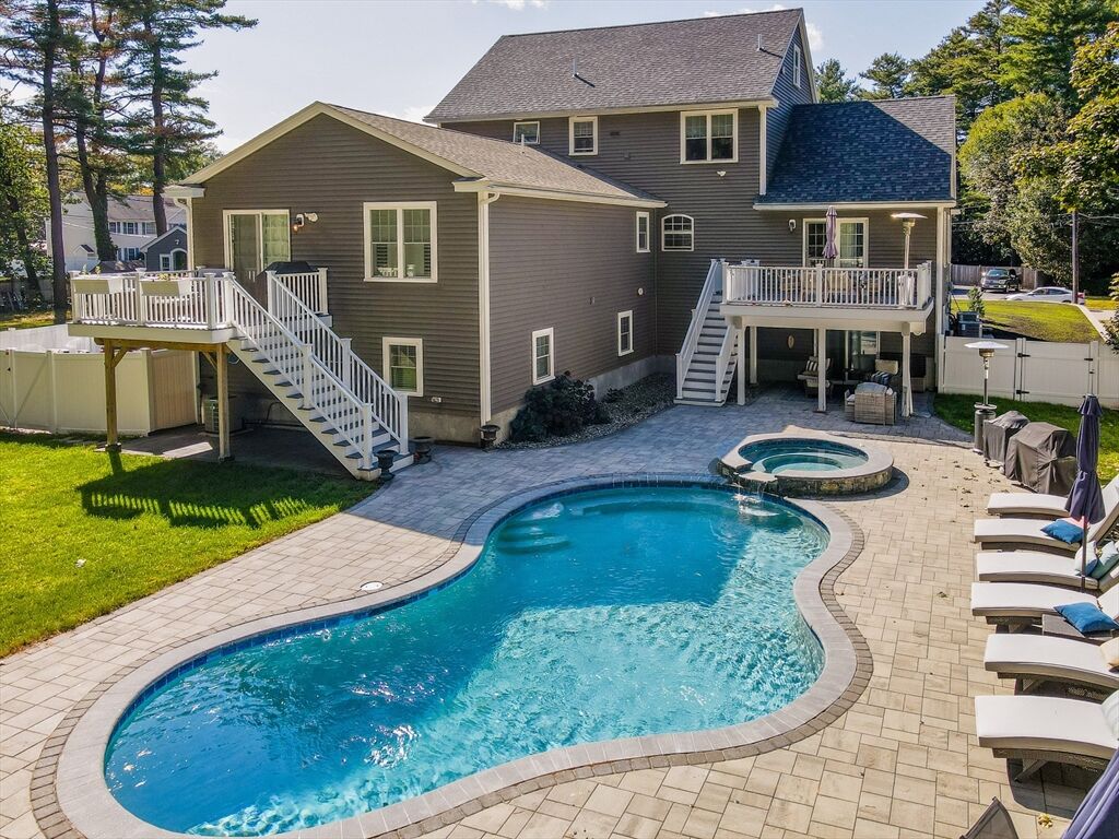 This stunning custom Colonial offers a spacious open-concept design perfect for both everyday living and entertaining. The gourmet kitchen features an oversized quartz island, Sub-Zero fridge, six-burner Wolf cook top and pantry. The kitchen flows into a dining room and family room with a fireplace, plus a versatile living/playroom.Upstairs, the primary suite includes a fireplace, walk-in closet, and a spa-like bath with dual vanities, a soaking tub, and a separate shower. Three additional bedrooms share a full bath with a double vanity and quartz countertops. The walk-up attic offers extra space with a bedroom and office. The finished basement includes a workout room, playroom, and half bath. The attached in-law suite has a private entrance, full kitchen, living room with fireplace, bedroom, and deck. The lower level is finished with a family room. Outside, enjoy a saltwater Gunite pool, hot tub, and cabana. The property also includes a three-car garage. Open House 11-1PM 11/8 11/9
