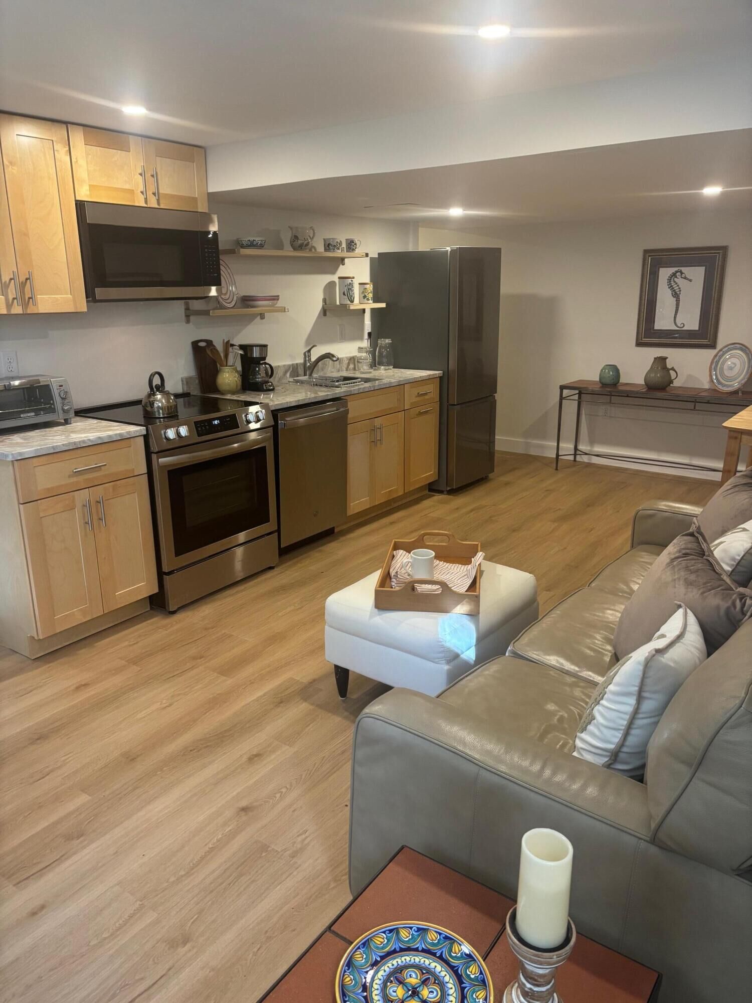 Welcome to this very comfortable and updated apartment in a safe and convenient location! Available immediately for a year lease but a shorter term is possible. The rent is $2,150 per month, including utilities. This apartment is brand new and beautifully appointed with a full sized kitchen, a laundry with washer and dryer, a bathroom with shower, a large bedroom with a generous closet. In the large living area there is plenty of space for watching TV, relaxing on the couch or working on your computer The separate entrance has a covered staircase that takes you into the unit. There are three windows, two of them are full casement windows which provide ample sunlight and ventilation. There is a private patio area and a spacious yard for you to relax and enjoy. This is an exceptional living space. All of this is set in a park-like setting close to the beach and many amenities. A rental application, proof of income, full credit report, and previous landlord references are required. The 1st and last month rent, plus a $1000 security deposit are due upon signing the lease. Only applicants with completed applications will be given appointments to see this property. Broker is owner.