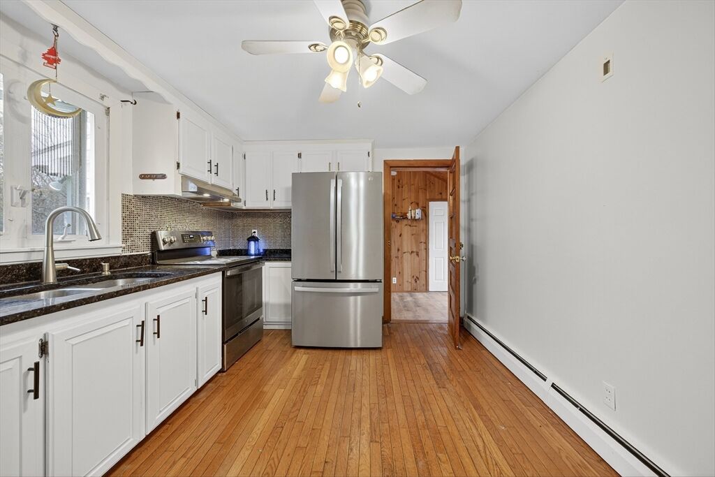 Welcome to this well-maintained 3-bedroom ranch home, located in Worcester's Greendale neighborhood near the West Boylston line. The living room features a cozy wood-burning stove, a stone accent wall with built-in shelves, parquet flooring, and a large bay window that fills the space with natural light. The eat-in kitchen offers ample counter and cabinet space, complemented by stainless steel appliances. Down the hall, you'll find a full bathroom and three spacious bedrooms. This home also includes a three-season porch, making it the perfect spot for relaxation. The property boasts a large yard with a storage shed and an attached garage, providing convenient access to highways, shopping, and dining. This location is truly ideal!