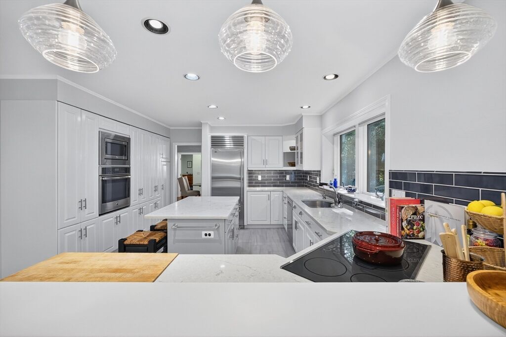 Set within the coveted Quanset Harbor Club, this expanded Cape rests at the end of a private drive surrounded by mature plantings and serene pond views. The classic white exterior with blue shutters evokes timeless Cape Cod charm, while inside, airy proportions and elegant updates define the space. A gracious foyer leads to a renovated kitchen with quartz counters, custom cabinetry, and wet bar—ideal for entertaining. The breakfast nook and vaulted great room open to a large pond-view deck, blending indoor comfort with nature. The first-floor primary suite offers privacy, complemented by formal living and dining rooms, a home office, and laundry. Upstairs, two guest bedrooms share a bath and a reading nook, with expansion potential upstairs and in the high-ceiling basement. Enjoy association access to a private beach, dock, kayak racks, and mooring field—all minutes from Orleans Center and Pleasant Bay.