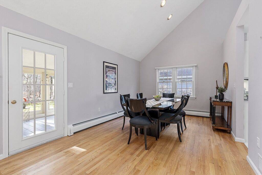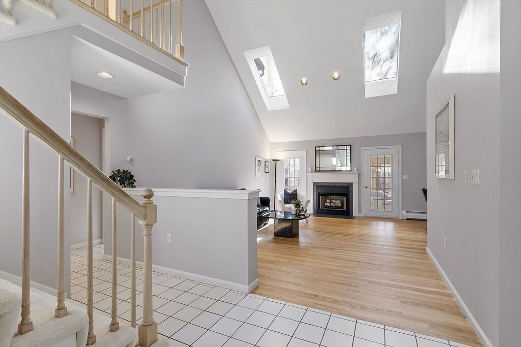 Welcome to this beautifully maintained 3-bedroom, 2.5-bathroom free-standing condo in Bedford's desirable Huckins Farm community. This inviting home opens to a generous light-filled living room, boasting 16'10 ceilings accented by skylights. The living space connects to a classically designed kitchen, complete with a cozy breakfast nook for casual dining. The separate dining area is ideal for entertaining or formal meals. The spacious first-floor primary suite offers the convenience of one-level living, while the 2 upstairs bedrooms provide flexible living options for guests, a home office, or hobby space. Enjoy wooded tranquility on the charming sunroom and private patio, ideal for morning coffee or relaxing evenings. As a resident of Huckins Farm, you'll have access to exceptional recreational facilities including a swimming pool, tennis and pickleball courts, walking trails, and more!