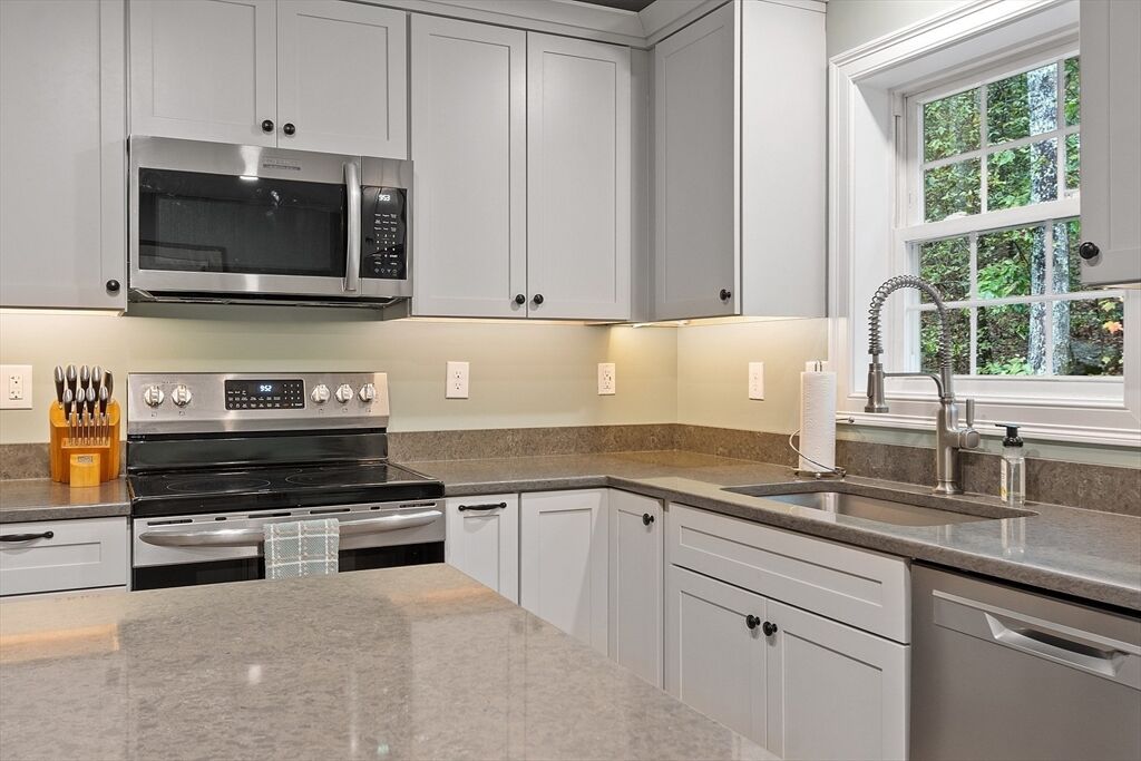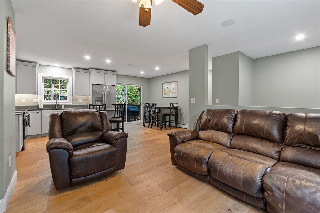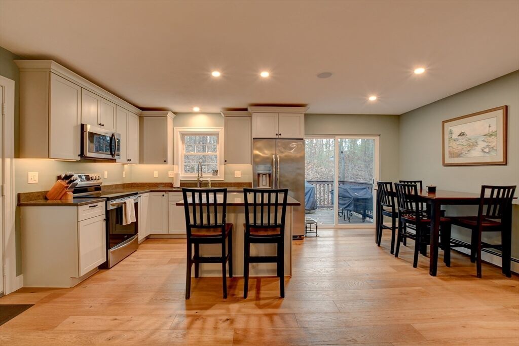 Welcome to 35 Hillside Drive, a beautifully updated 3-bedroom, 1.5-bath split-level home offering comfort, style, and privacy just steps from Lake Monomonac. This move-in-ready property features a new roof, new kitchen with stainless steel appliances, quartz countertops, and a spacious island ideal for everyday living and entertaining. The main level showcases engineered hardwood flooring, recessed lighting, built-in smart speakers, and a new slider that opens to a back deck overlooking the backyard. All bedrooms feature Pergo flooring, the full bath includes tile, and the primary bedroom offers a convenient half bath. The finished lower level adds flexible space, perfect for a family room, home office, or gym. Additional highlights include a two-car attached garage and direct access to scenic walking trails. This home combines updated systems with practical design in a location perfect for nature lovers and those seeking proximity to the lake.