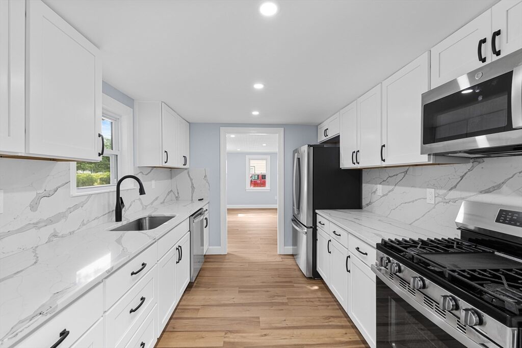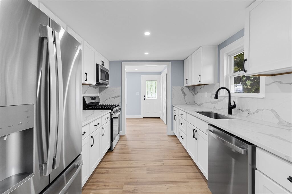 Completely renovated 4-bedroom, 2-bathroom home on a corner lot with paved driveway and detached garage. Stunning kitchen with stainless steel appliances, quartz countertops, backsplash, and solid wood soft-close cabinets. Major updates include new roof, vinyl siding, gutters, windows, electrical, plumbing, tankless heating system, and recessed lighting. Spacious yard and deck provide plenty of outdoor space. Located near the water with opportunities for boating, kayaking, and enjoying sunrise and sunset views. Not in a flood zone. Move-in ready!