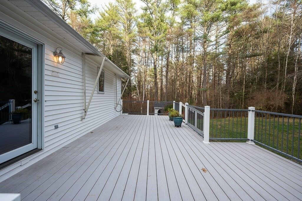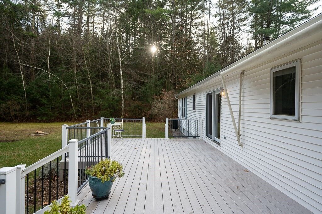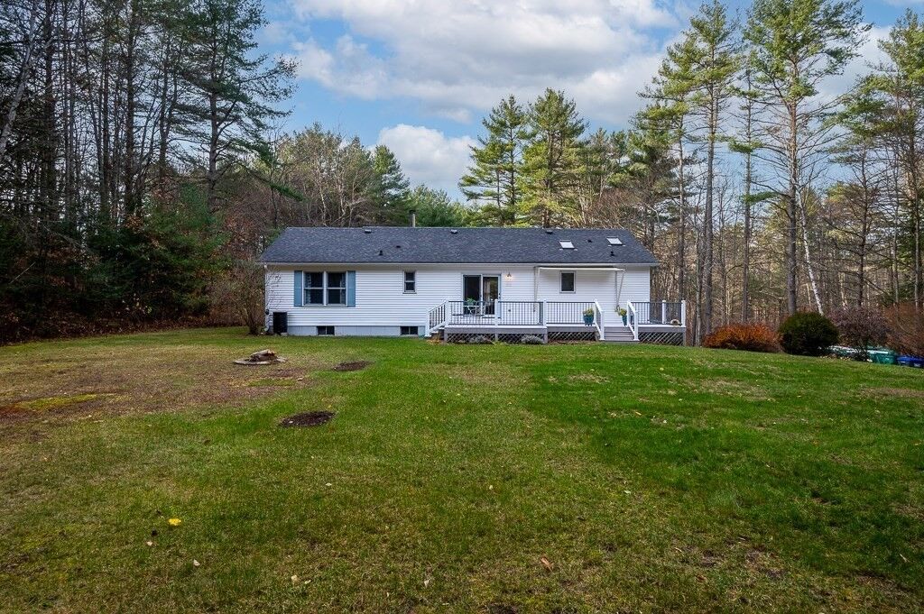 ONE OWNER , WELL MAINTAINED 3-4 bedroom ranch , 2 Full baths . Main bedroom suite with Full bath . Separate wing with 2 bedrooms & 2nd living room or create a 4th bedroom .Open living room, kitchen -vaulted ceilings with skylights , dining room with slider to oversized composite deck overlooking serene , private tree lined , flat back yard . HARDWOOD FLOORS . One may Opt to use the all nighter Custom wood stove to heat entire house . Generator ready electric. Finished room in lower level not included in sq ft. Long driveway , plenty of parking , attractive landscaping . Over 2 acres , great for entertaining , gardening and pets. Low maintenance vinyl siding , Low taxes & Lower cost municipal electric makes this a smart choice!