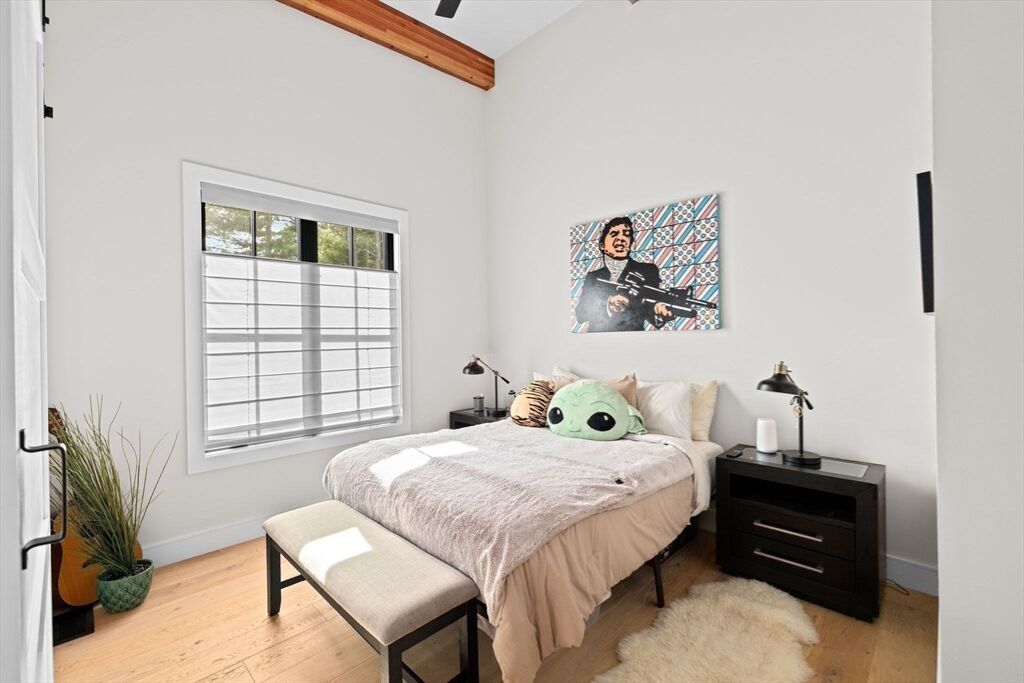 Bedroom 2 | Ceiling Fan(s) Beamed Ceilings Closet/Cabinets - Custom Built Flooring - Hardwood Recessed Lighting |