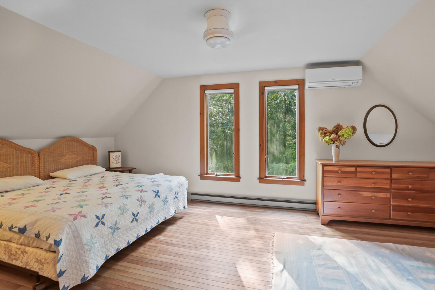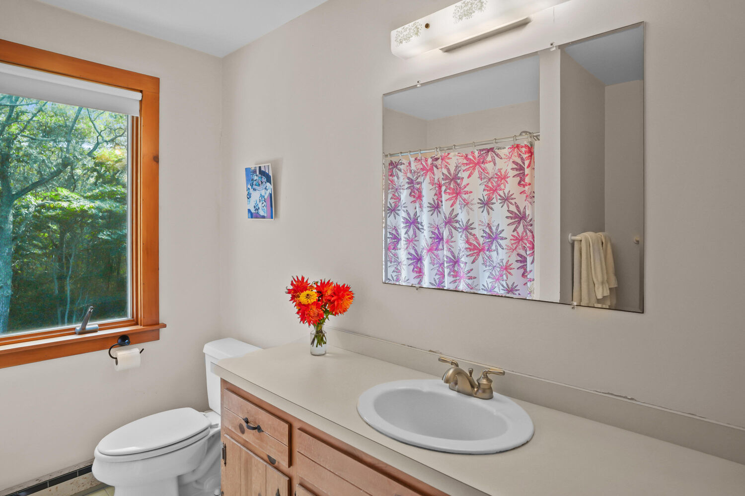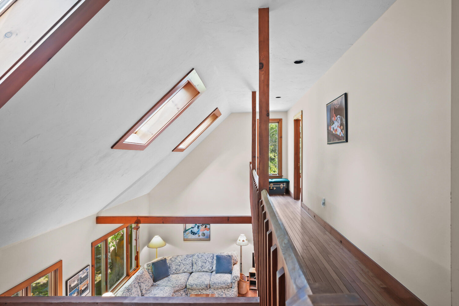 Nestled off Hidden Village Road on 2.1 private wooded acres, this spacious 4-bedroom, 2-bath home offers the perfect blend of peace and convenience--just 1.5 miles from Lambert's Cove Beach and a short distance to Ice House Pond. Inside, enjoy an open-concept layout with cathedral ceilings, skylights, and an abundance of natural light. Sliding doors lead to a sunny, south-facing deck with tranquil woodland views. The main level features a large primary bedroom with an adjoining full bath, while the second floor includes a second spacious bedroom, full bath, and two additional guest bedrooms. Additional highlights include a full basement with finishing potential, outdoor shower, large deck with awning, great yard, and hot tub. Located minutes from Up-Island Cronig's, State Road Restaurant, West Tisbury Post Office, and Conroy's Apothecary.