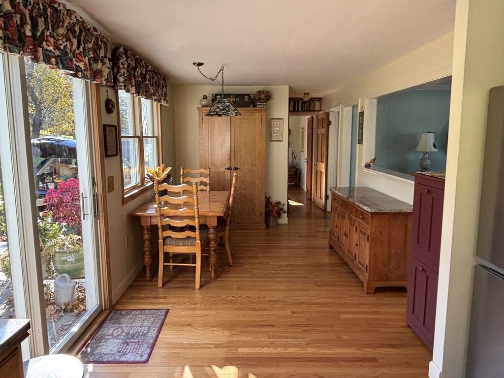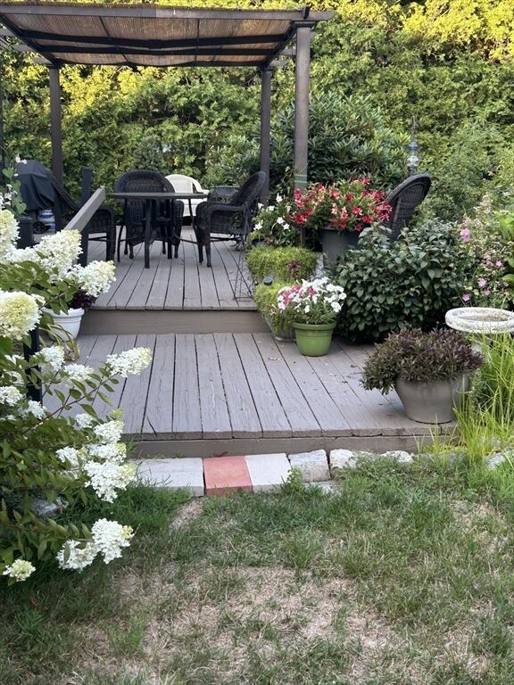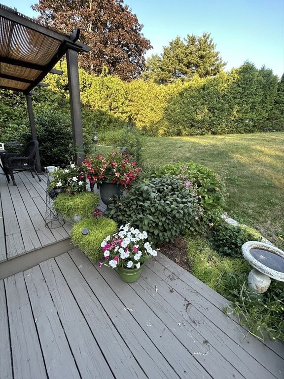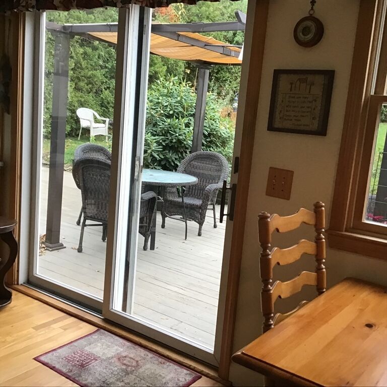 Southern exposure lets the sun shine in! Double sliders welcome the light and help warm you in winter as well! Remodeled kitchen with tall arched window lights up the east wall.Stone countertops, hardwood floors,stainless appliances and a dishwasher with a cabinet door.The connected dining room works to bring family, guests and hosts together.Living room wall features a large cut-out area that provides a view to the back yard. Convenient primary bedroom on 1st floor offers hardwood floors. 2nd bedroom on the main floor has also been used as an office and a den as family needs evolve, 2 more rooms upstairs have also been used as bedrooms, an extra TV room and a play room. An oversized L-shaped deck big enough for a small shed and a place to keep the grill area away from the dining/sitting area. A pergola provides shade. The corner lot allows for an additional driveway that can accomodate up to 4 cars, 2 sides of the yard are lined with arbor vitae for privacy.Siding mimics cedar shakes