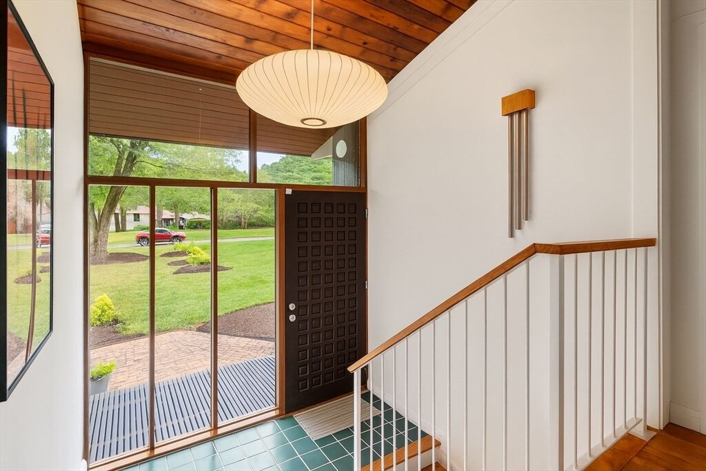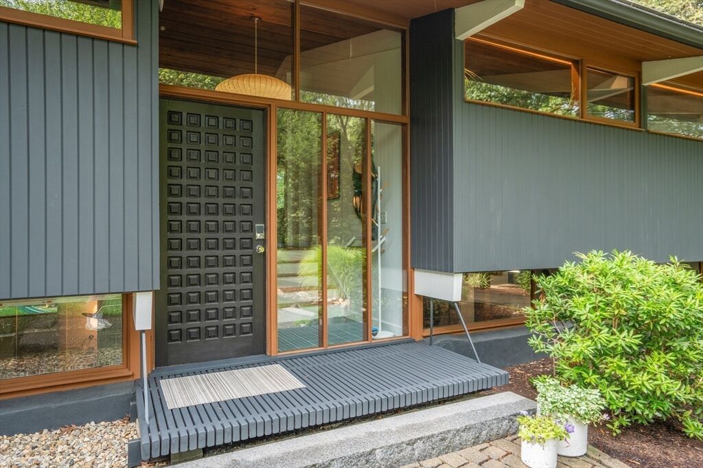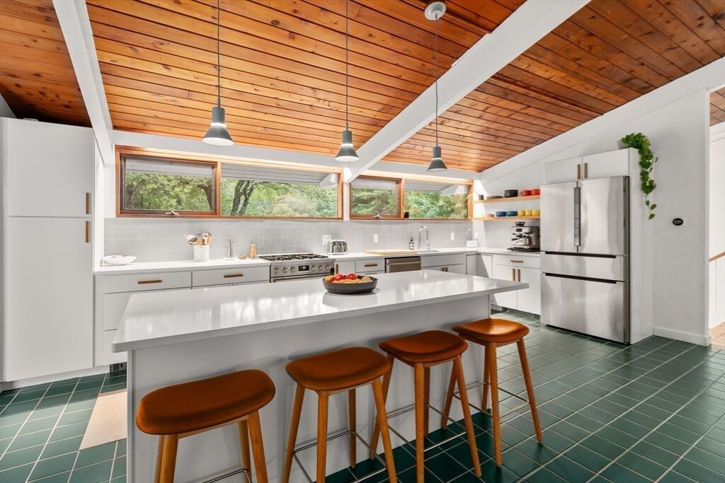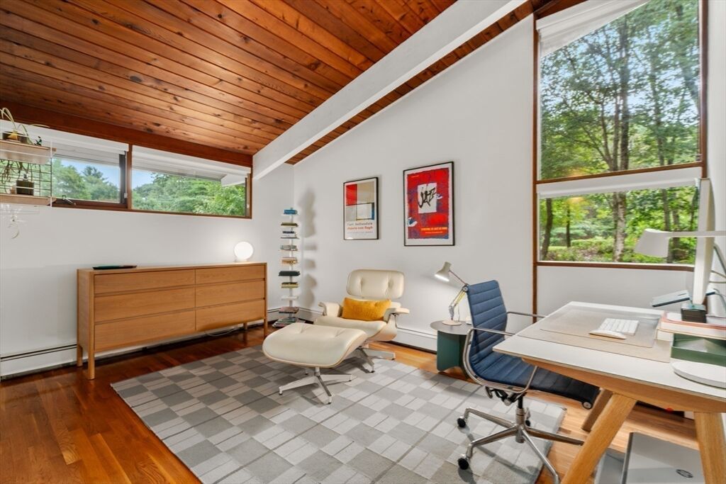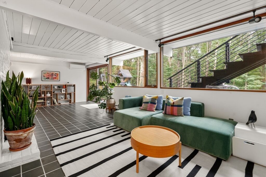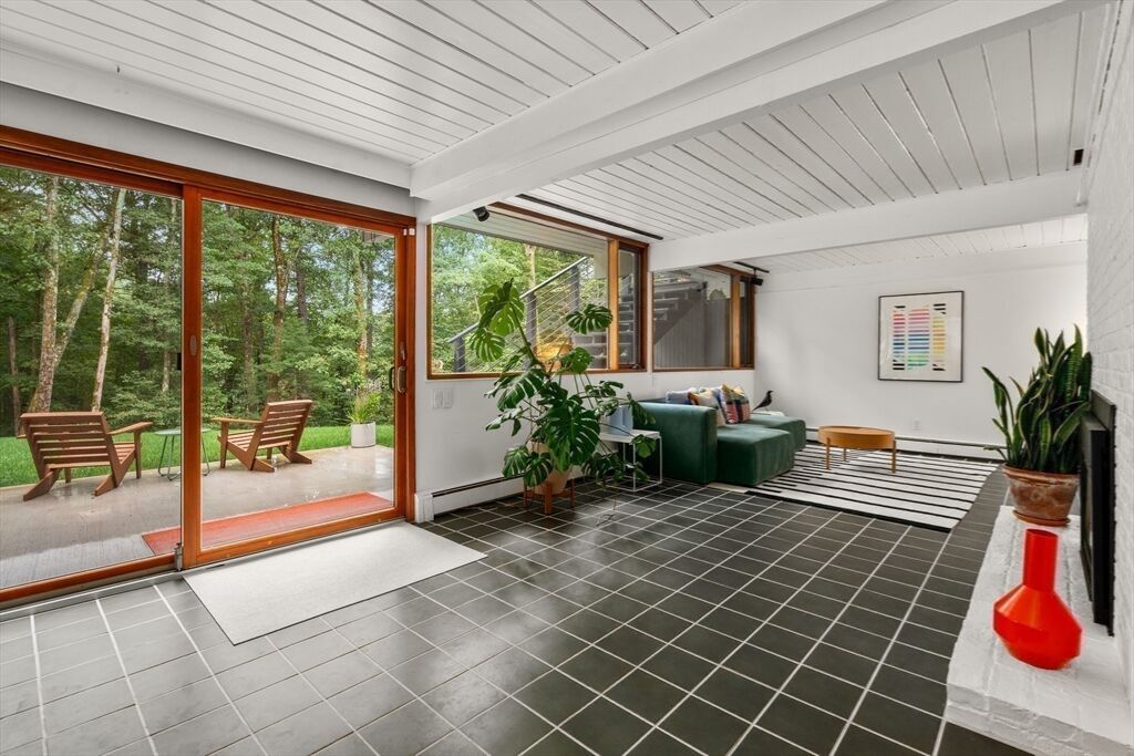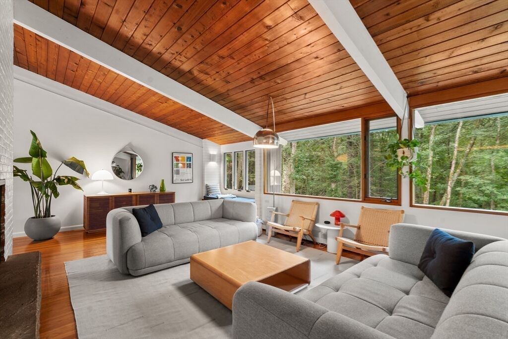 This one is truly unique! Welcome to this newly renovated Acorn Deck House, a stunning blend of mid-century and Scandinavian design tucked on a wooded 2-acre lot. Soaring California Redwood vaulted ceilings, dramatic lines, and expansive windows create a treehouse-like feel with natural light pouring into every room. The floor-to-ceiling wood-burning fireplace with a new stainless steel liner anchors the open living space. A spacious dining area flows into a sleek kitchen with a wet bar, Miele oven, and Bosch appliances. Custom sliders open to an oversized deck overlooking private, landscaped grounds and a fenced backyard. Modern updates include new garage doors, 2022 roof, and whole-home water filtration. The main level offers a primary bedroom, second bedroom, and full bath. The lower level features a large family room with gas fireplace, two additional bedrooms, full bath, and laundry. Minutes to Route 1, Bradley Palmer State Park, Ipswich River, and an easy commute to Boston.