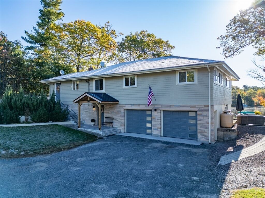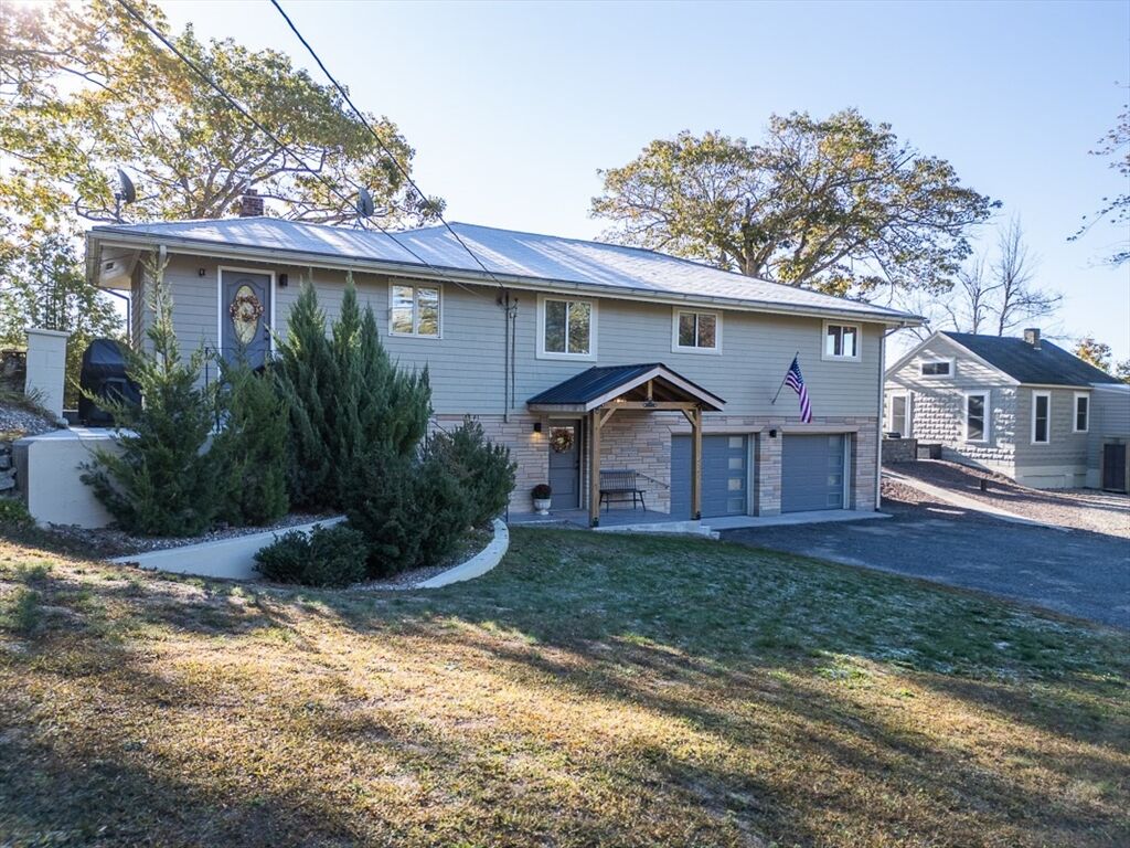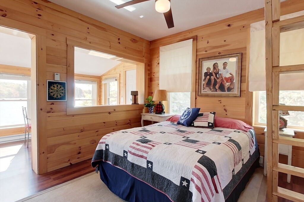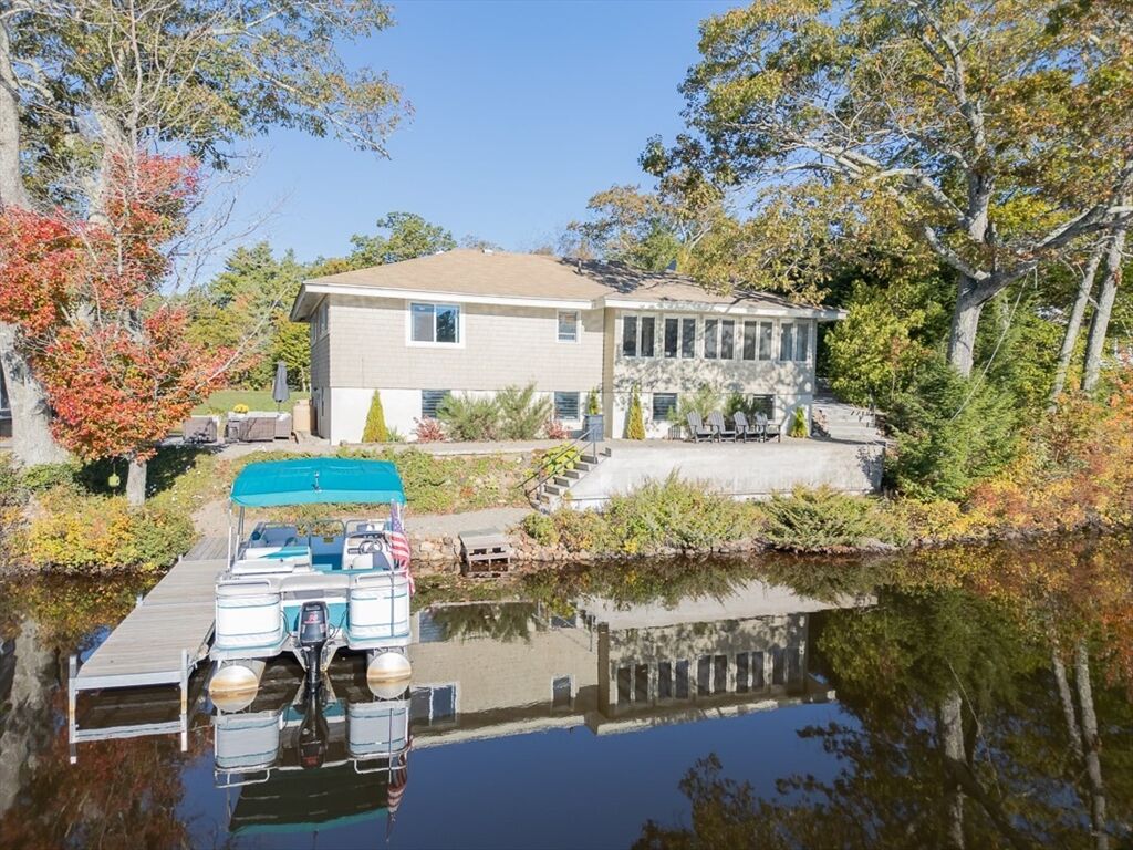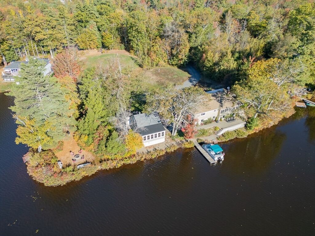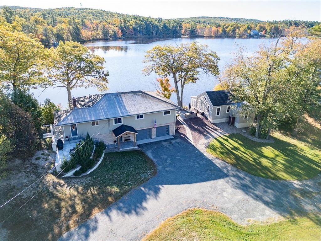 Experience year-round waterfront living on nearly 2.5 acres w/ over 400 ft of frontage! This stunning 2-bedroom raised ranch w/ a detached 1-bedroom lofted cottage—each w/ its own kitchen & living area—has been beautifully updated throughout. Enjoy new floors, counters, & island, fully renovated baths, added electric fireplaces, & new garage doors and insulation (2019). The main home’s open layout showcases a grand kitchen w/ white shaker cabinets, stainless farmers sink, & coffered ceilings that flow into a sun-drenched living & dining area wrapped in 14 windows framing serene water views. Both bedrooms feature private ensuites. Outdoors, enjoy professionally landscaped grounds, an outdoor shower, new dock (power boats welcome), fire pit area, & oversized heated garage. The unfinished lower level offers excellent storage or future expansion. The charming guest cottage completes this private, picturesque retreat. Showings begin at an Open House on Sat, 10/18 from 11:00-1:00.