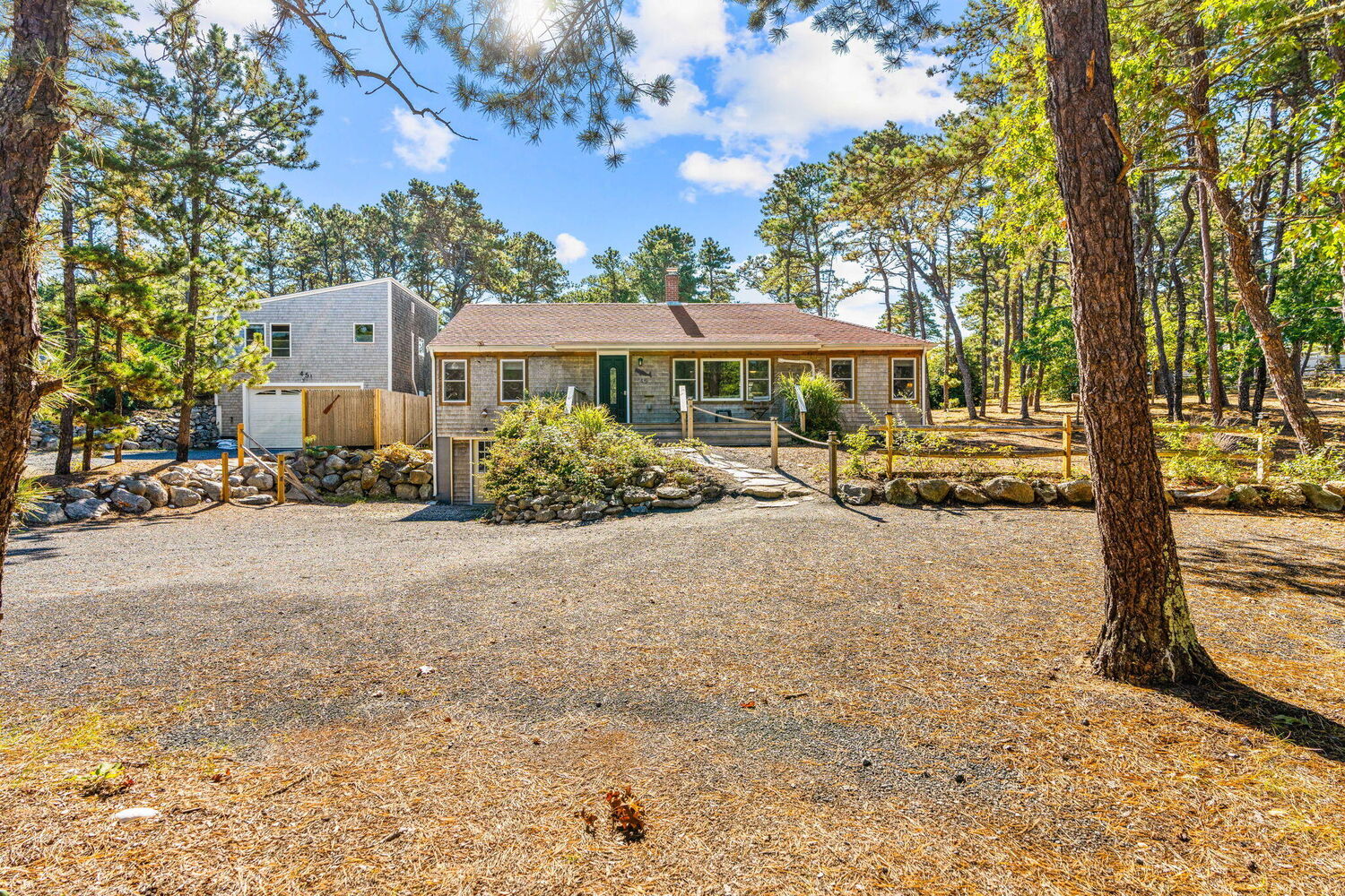 Tucked away in Wellfleet's sought-after Indian Neck area, this private 3-bed, 3.5-bath haven is a stone's throw from beloved bay beaches and a short jaunt to Wellfleet center. Set on a sprawling .88-acre lot, the heart of the property is the main house that's rooted in 1950s charm (renovated in 2015 with new electric, plumbing, windows, roof, and more). The open floor plan offers easy beach living, while the primary suite, separate from the two bedrooms, is a quiet retreat. The front deck is the mainstay, a perfect perch to watch the world go by. Plus, there's a detached two-story garage/studio, built in 2020, where a 576-sf bonus space with full bath awaits your final touches - ideal for a home office, creative pursuits, or a possible ADU. The lower level garage features a high ceiling for boat storage. Perfectly positioned for memorable days by the water, enjoy proximity to several beaches - Burton Baker and Hiawatha are each .4 mile and Indian Neck is .8 mile. The large, private yard features a brand new back deck and ample space for a pool. With its incredible location, fantastic lot, and laid-back feel, this home embodies Wellfleet character and offers myriad possibilities.